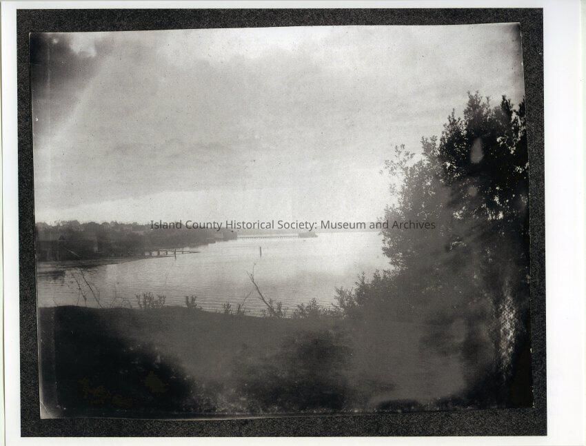 Photo of Coupeville waterfront and wharf. Lovejoy's Mill in foreground. Town is in shadow so not mcuh is visible. On the back: From album 83-06-77, Looking west toward Coupeville; Lovejoy boat launch and Coupeville dock.