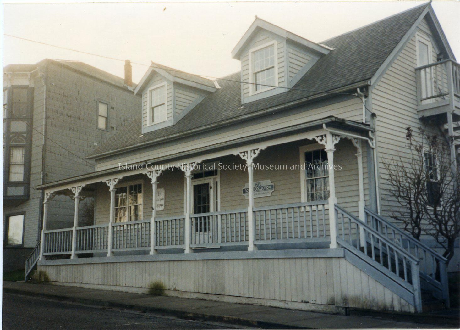 Photo of the Robertson House, built in 1864, at 5 NW Front Street. In the 1950s it was a Chinese restaurant, then a kitchen shop, art gallery and studio and is now Seaside Spa and Salon. Central door, two windows with long front porch and two sets of stairs. Two dormers.Made/Created