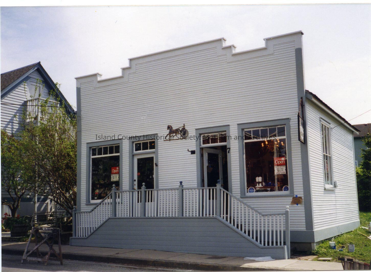 Photo of the building at 13 (now 7) NW Front Street. Built in 1936, as a barber shop and antique shop, then a beauty shop, and a number of other businesses since. It is now Marbly. Two front doors, two windows, false front, two set of steps to porch.Made/Created