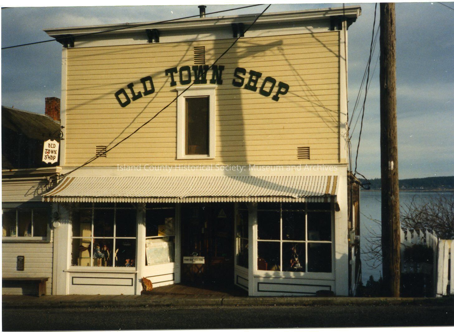 Photo of the building at 2 NW Front Street, built in 1890. It was the Race drugstore, shoe store, apartment in the lower level, and now Aqua gift store. It has a false front, large front windows and central inset door with awning. IT was the Old Town Shop.Made/Created