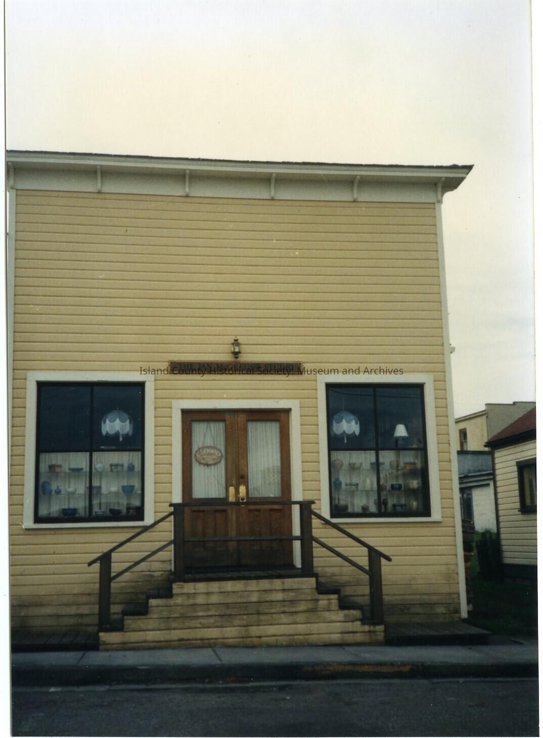 Photo of the building on 19 NW Front Street; it was built in 1905/1906. Sign over the central double door: The Jan McGregor Studio. It was built for the Island County Times newspaper office until it moved to Oak Harbor in the 19030s. A variety of shops/commercial ventures and has Japapese items and antiques. Large windows flank the front door which has a small porch with two staircases leading up. False front. Painted yellow with white trim.