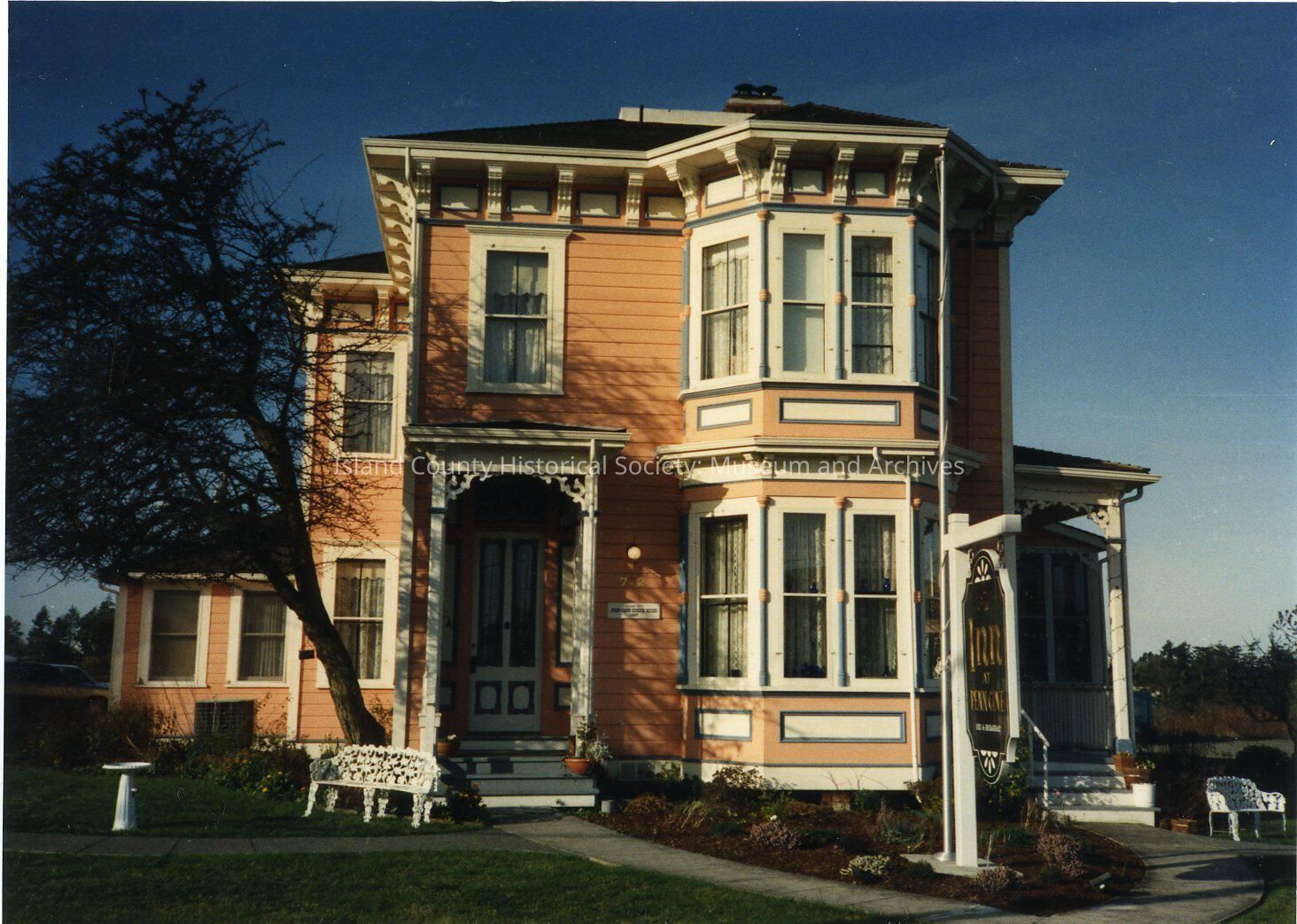 Photo of the building at 702 N. Main Street. It is a two-story, pink building with white trim. Sign says Inn at Penn Cove. It is now the Blue Goose Inn B&B. Italianate, built in 1887 by Lovejoy for John and Jane Kineth. It has a two-story bay window on the right. Portico over the two doors.