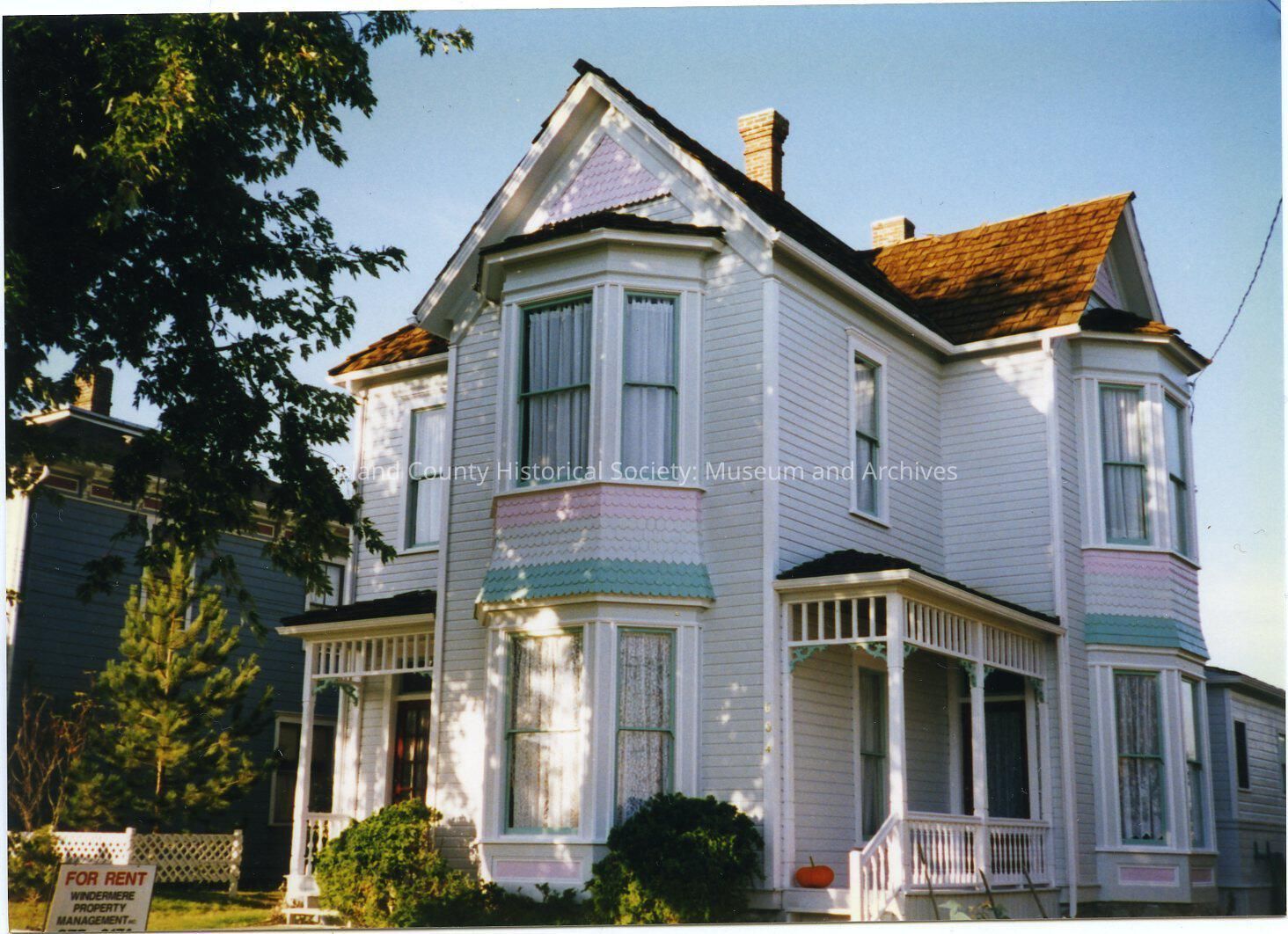 Photo of the building at 604 N. Main Street. It is a two-story, white building with pink and teal trim. Built in 1888; known as the Highwarden House. It has two two-story bay windows on the front and on the right. Portico over the two doors. Cedar shake roof. Now an apothecary shop.