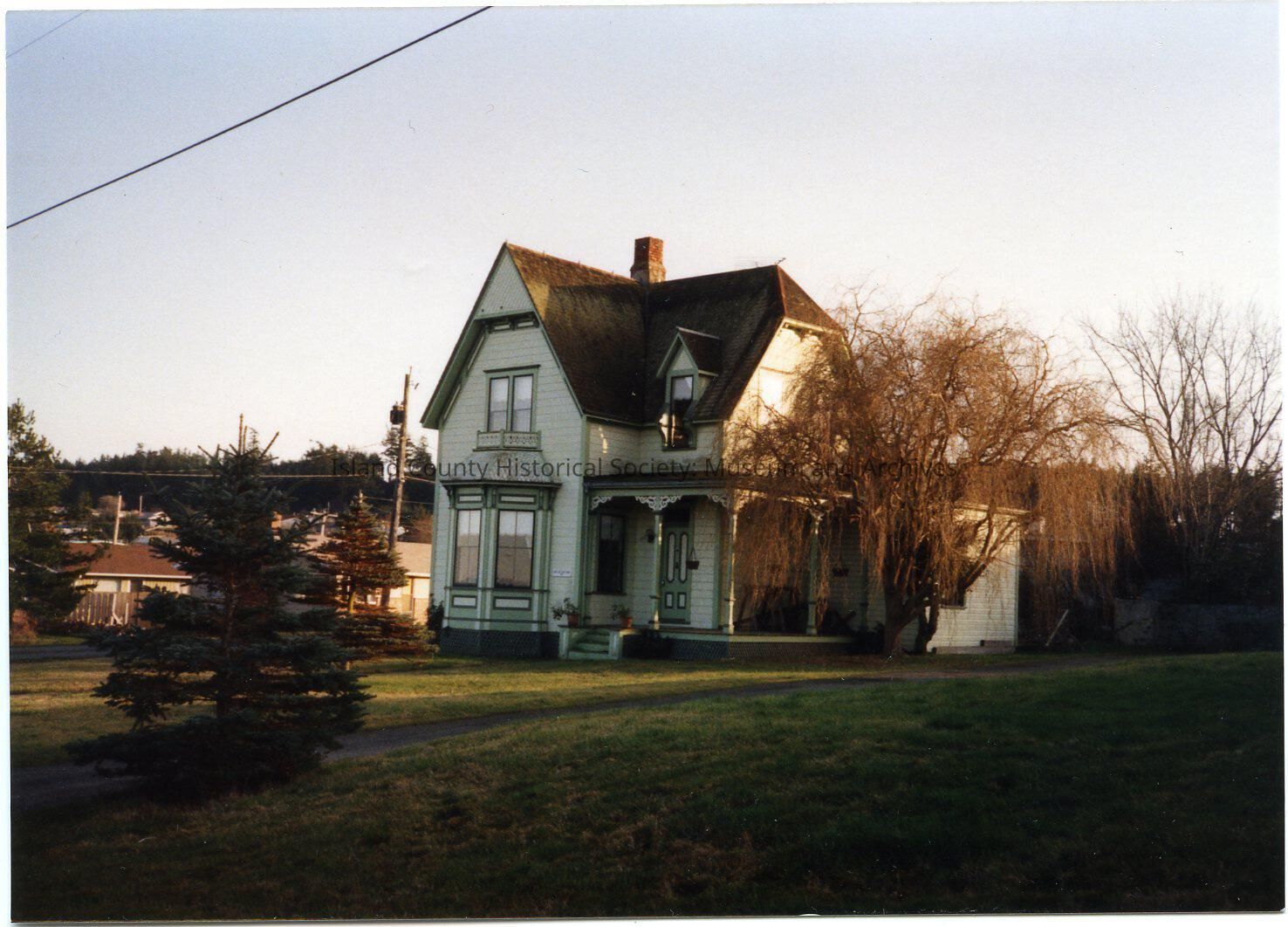 Photo of the building at 307 NE Front Street, private residence. It has a bay window in front, porch, dormer, at least one chimney. Captain Joseph Clapp house, built in 1886, Queen Anne style. Green with dark green trim.Made/Created