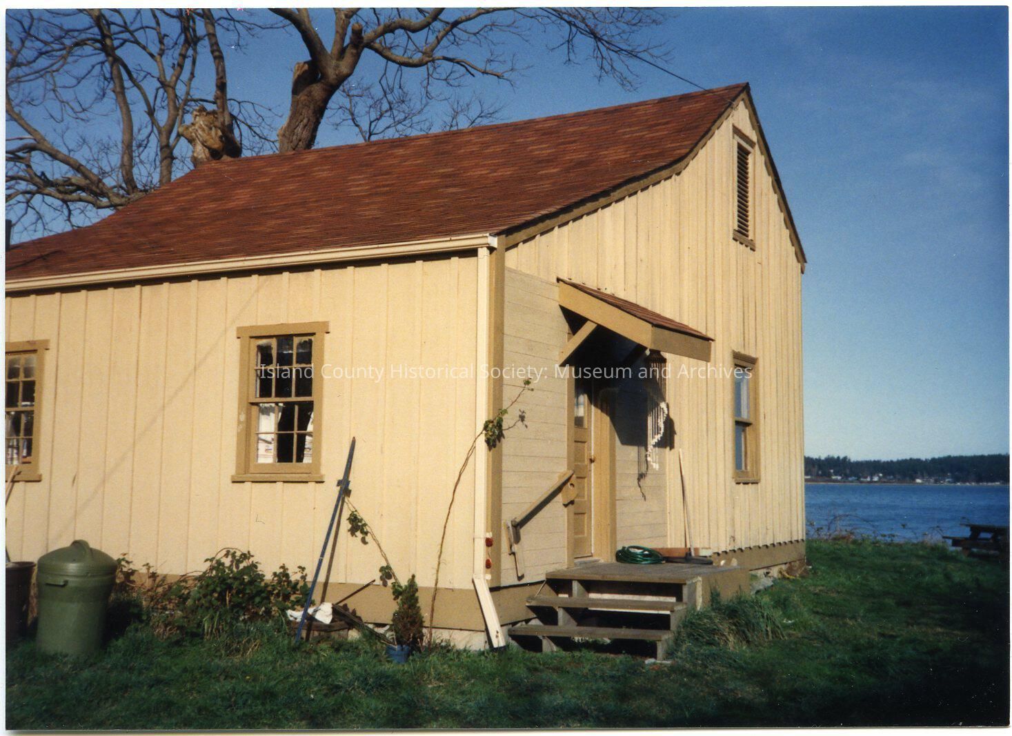 Captain Coupe house up close to the back and side. A tree is barely visible behind the house. Penn Cove is also visibel on the right of the photo.
