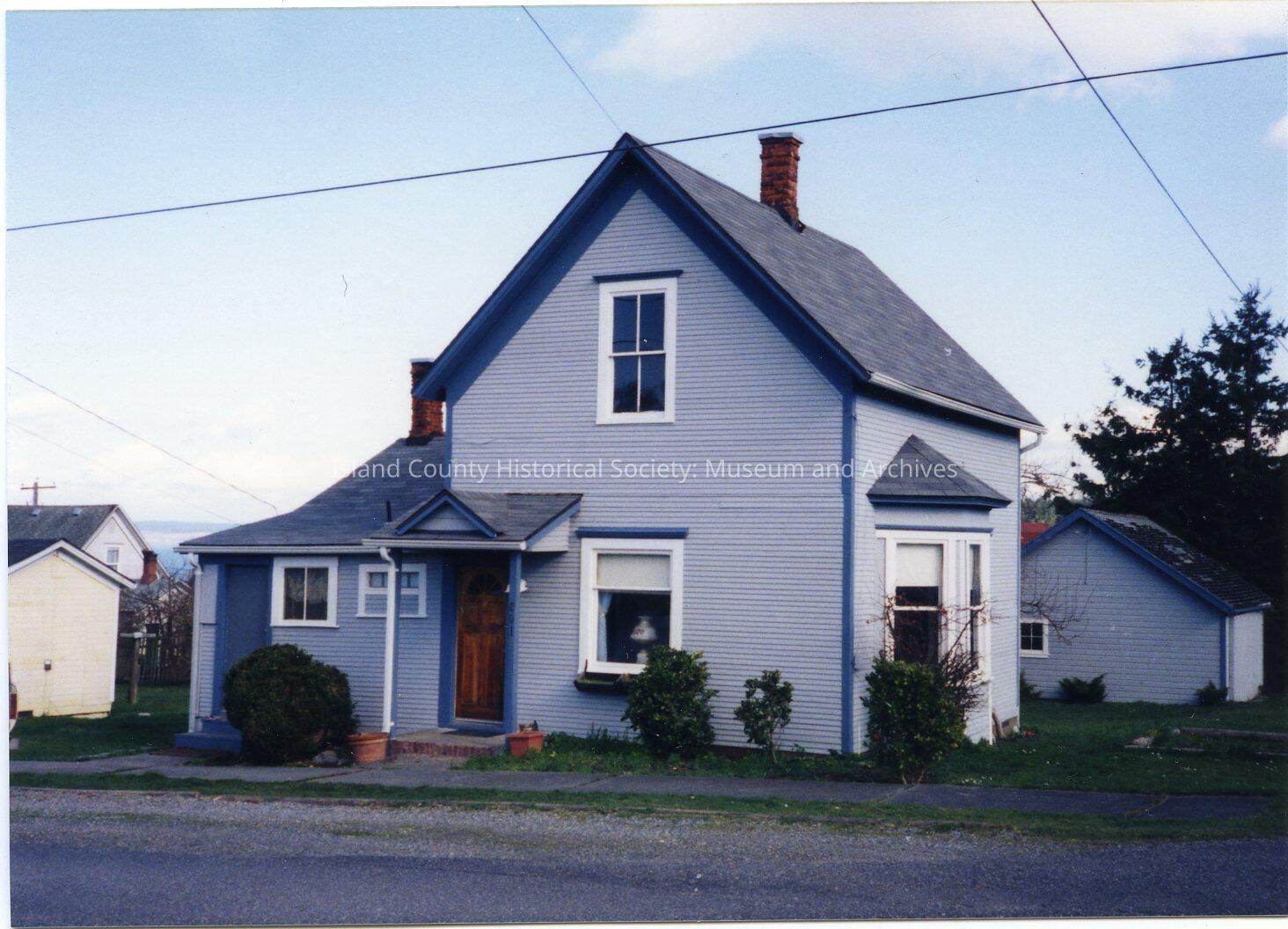 Photo of a house, two stories on the right with a steep roof. At least two chimneys. Bay window on the right side. Portico over front door. Addition to the left with two windows and a door. Blue with wihte and blue trim. From a note: Stark, Lovejoy, on NE Haller Street.Made/Created