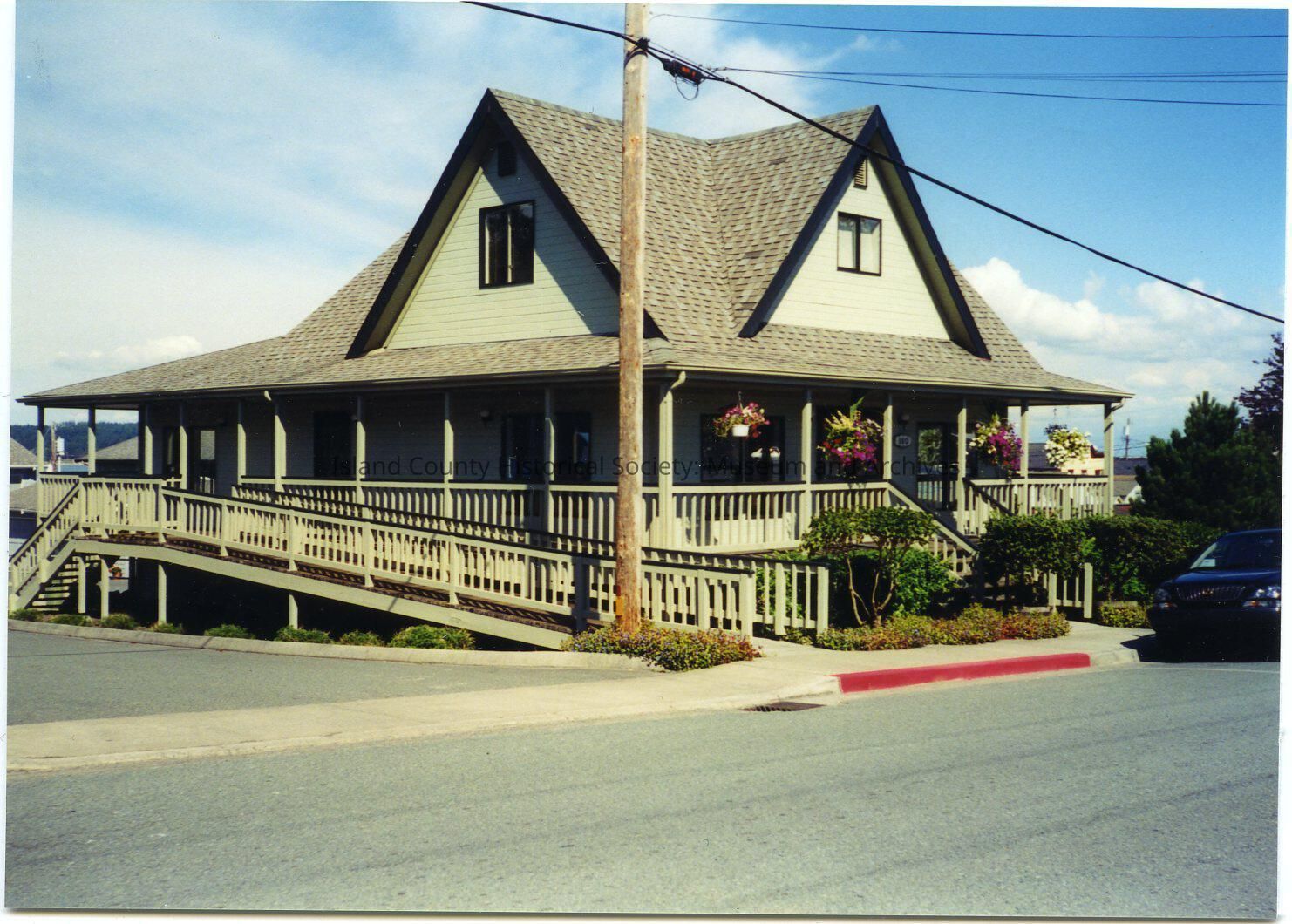 Photo of a two-story house, porch around at least three side, ramp on the right and stairs going down in the back as well as stairs to the front door. It was originally on Front Street and was moved to this location on Coveland Street across from the Post Office, about 1916. It is green with green trim. It is now law offices. It is 180 NW Coveland Street.Made/Created