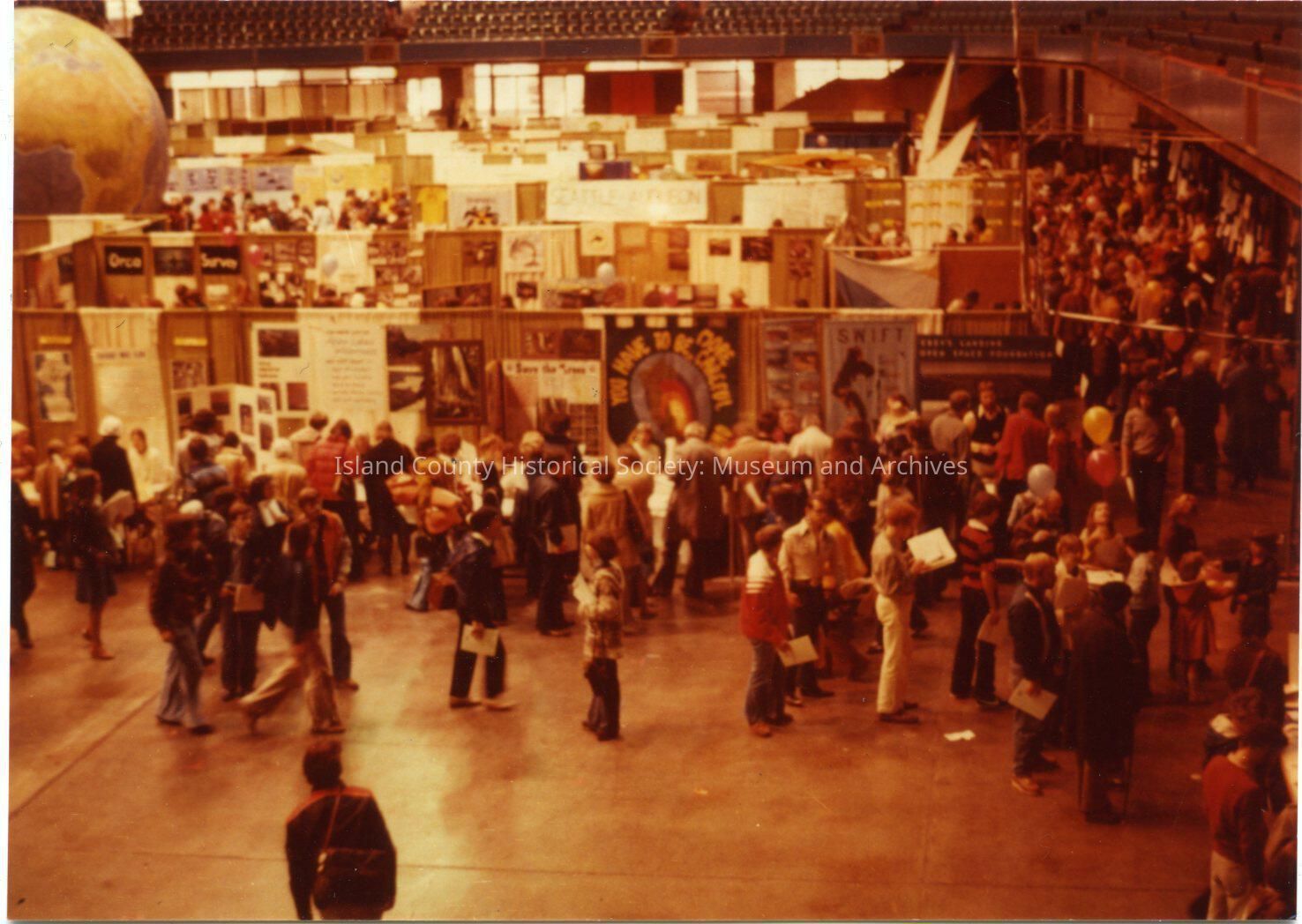 Photo of a exhibition area with people looking at booths with banners, leaflets, etc. On the back: Visitors at booths - environmental organizations, In foreground, Save the Trees, SWIFT, Ebey's Landing Open Space Foundation. Cousteau Involvement Day Seattle Science Center. Oct. 29, 1977