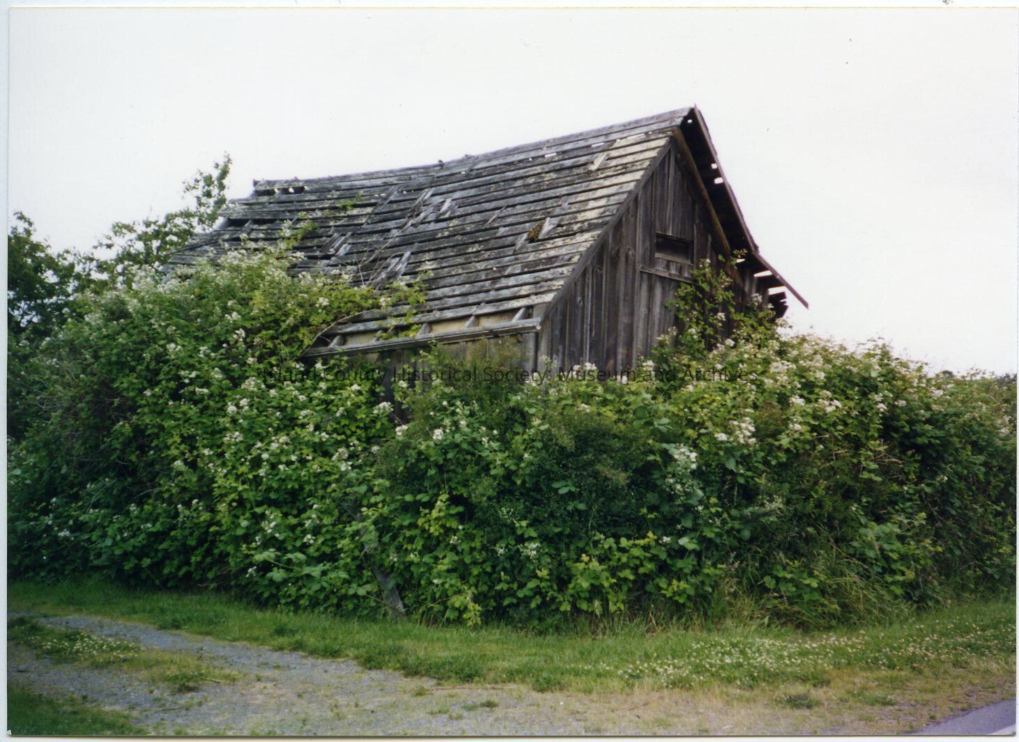 The barn in front of the Captain Coupe house on 9th Street. The barn is surrounded by bushes, roses, and blackberries. Since the photo, the barn has been repaired.