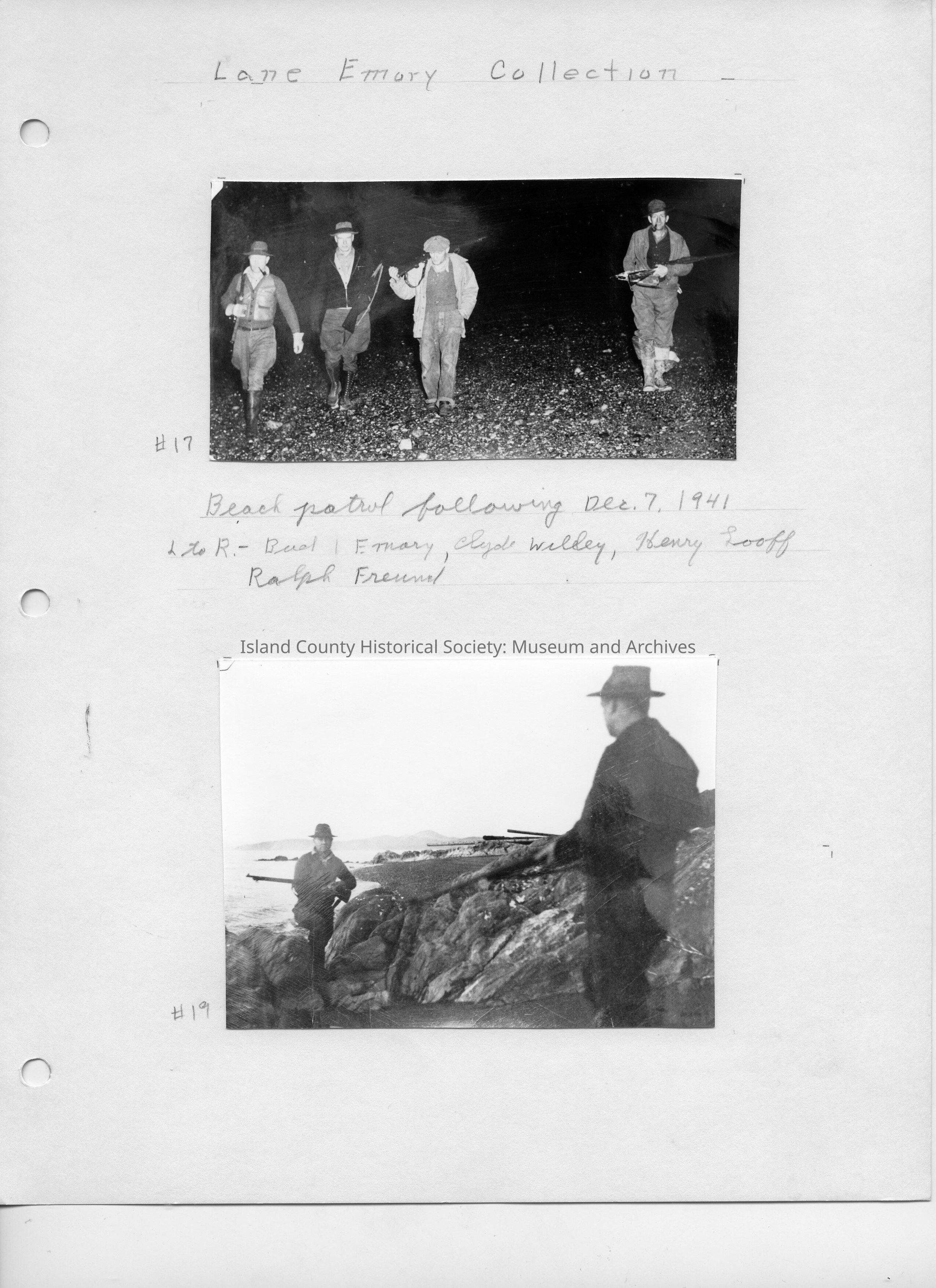 Top Photo - 4.75"W x 2.5"H - Photo of four men carrying guns walking down a beach at night. Below the photo is written: "Beach patrol following Dec. 7, 1941. Left to right - Bud Emory, Clyde Welly, Henry Looff, Ralph Freund."