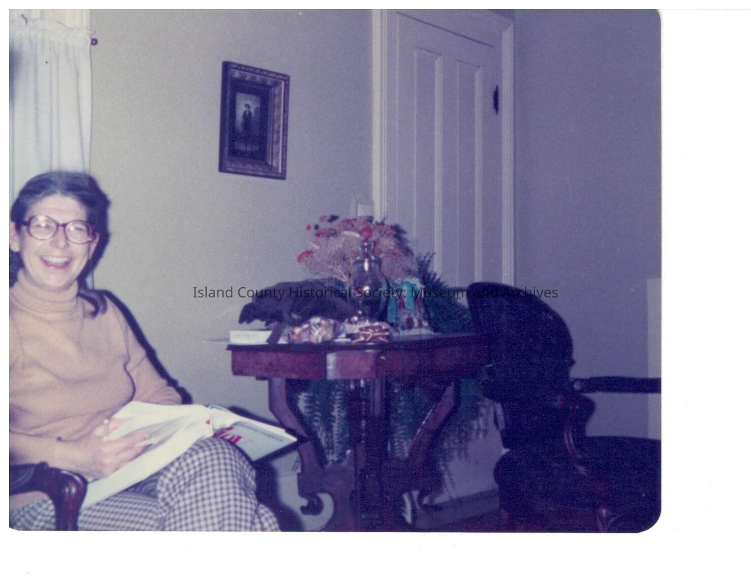 This is a photo of Jimmie Jean Cook in her living room circa 1970. in this photo Jimmie Jean is sitting in a chair holding a book. Other items in the picture include a single photo hanging on the wall behind subject and over a pedestal style side table. Slightly faded color photo.