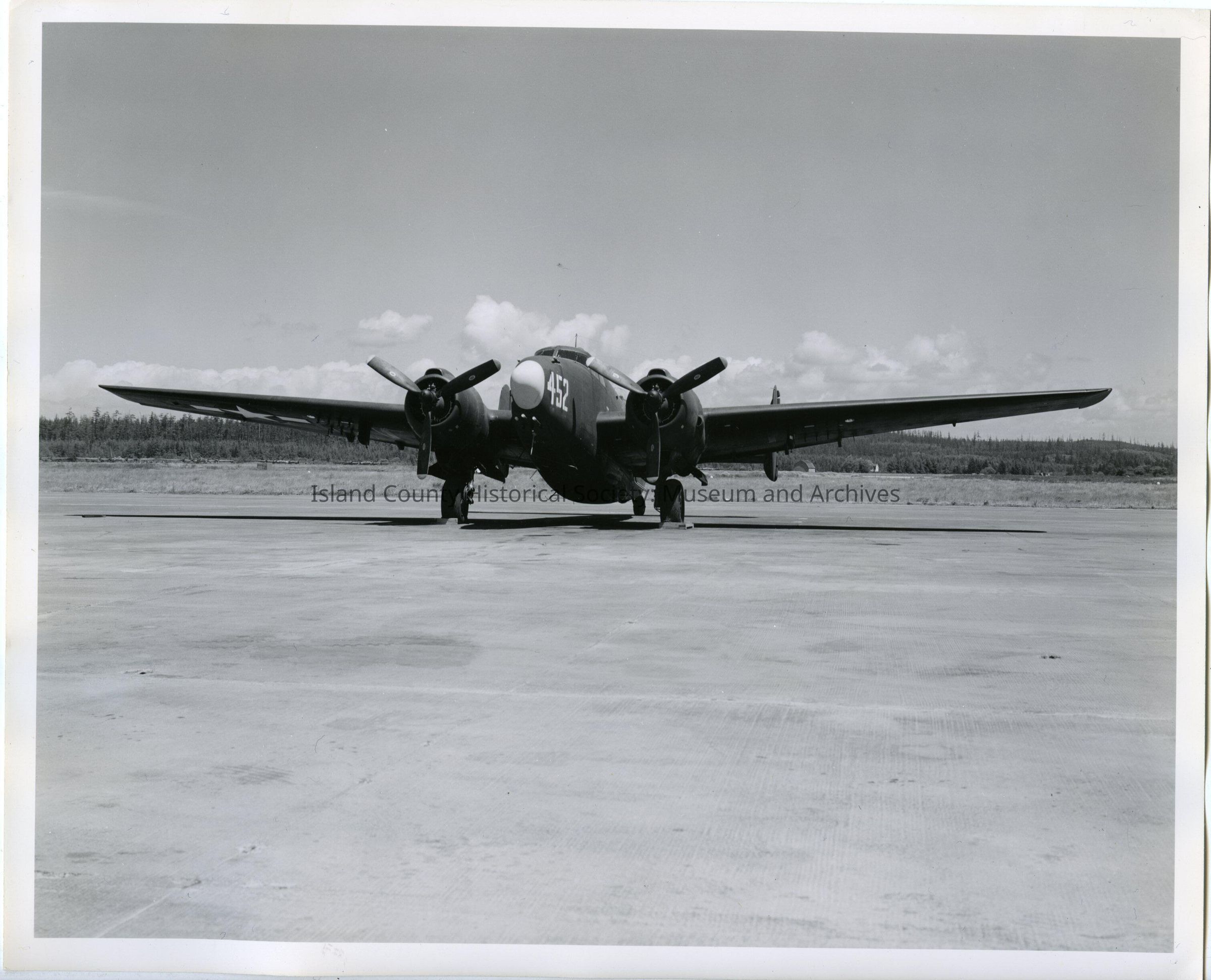 A photo of a Navy plane on the ground. Typed on the back is "U.S. Naval Air Station, Whidbey Island, Washington, Whid 4083, 11 June 1945." , etc.Made/Created