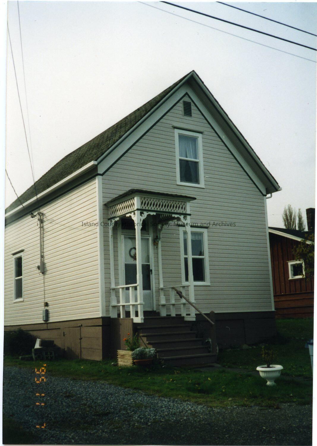 Photo of a two-story house, portico at the offset front door, with decorated columns and top, very steep roof. It is at 205 NE 9th Street and was known as the Hesselgrave rental house. It was built in 1890. Photo dated Nov. 7, 1995. It is at 205 NE 9th Street.Made/Created