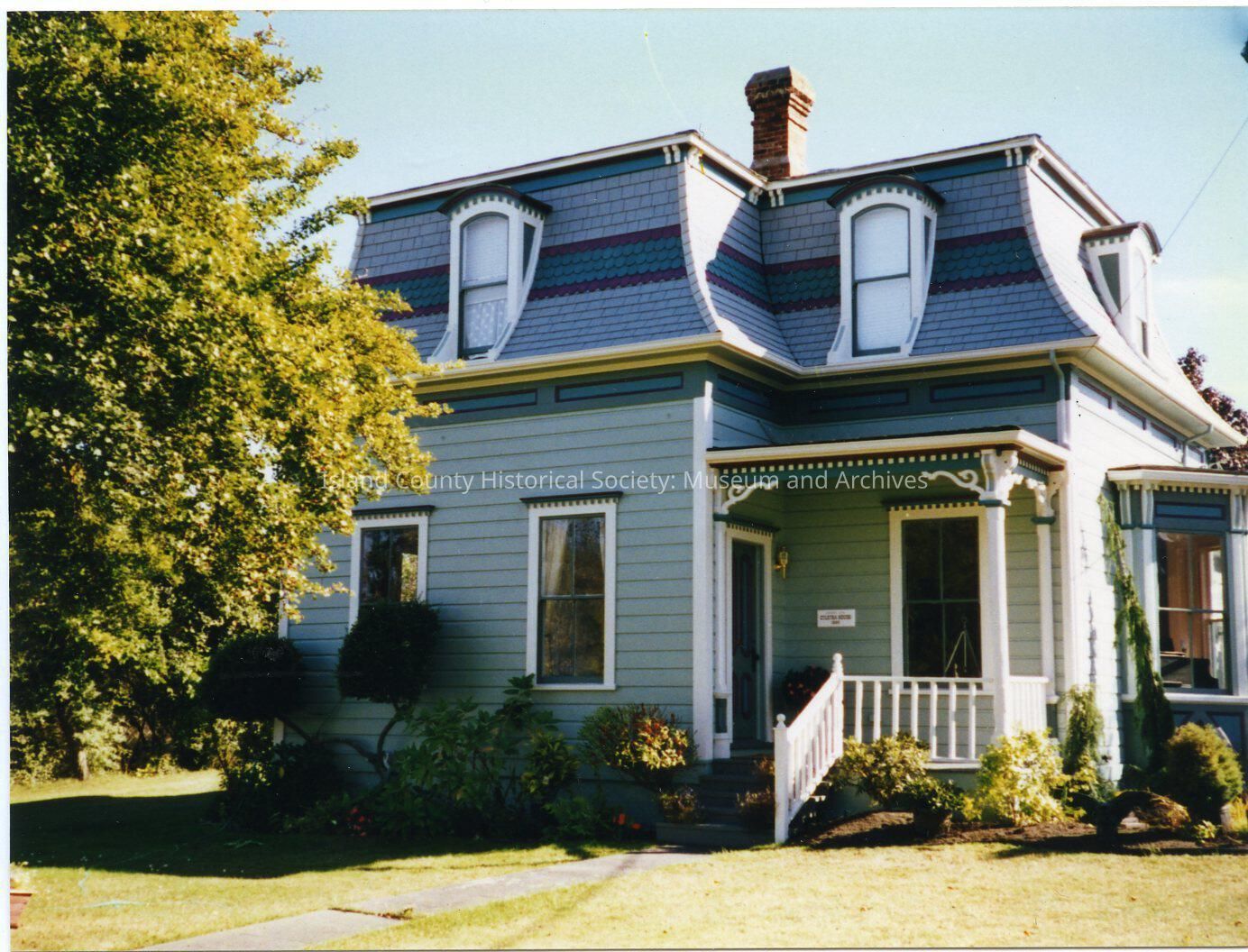 Photo of the building at 101 NE 7th Street. It is a two-story, pale blue/green building, teal trim, built in 1889, and known as the Zylstra House. Built by Lovejoy for himself then sold it. Jame Zylstra lived in it from 1917 to 1954. Front door portico/small porch with decorated columns, sloping roof with dormers and multi-colored roof shingles, trees and bushes, front bay window.Made/Created
