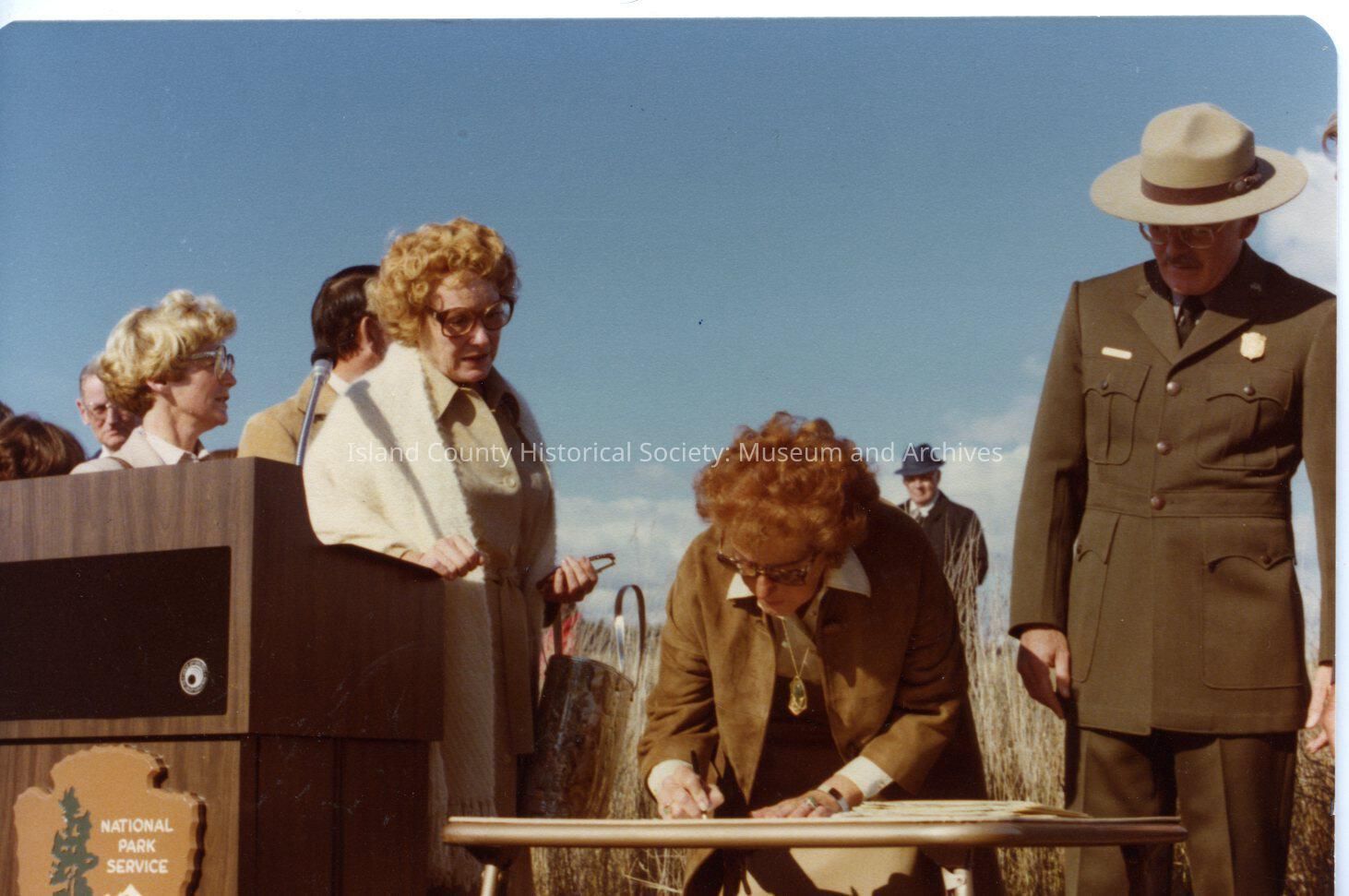 Reverse of photo shows date 10/29/80. On left: Lou Romeo, Marion Smith (watching signer), Roberta Smith (signer), Reed Jarvis (in uniform). National Park Service was a party to the signing.