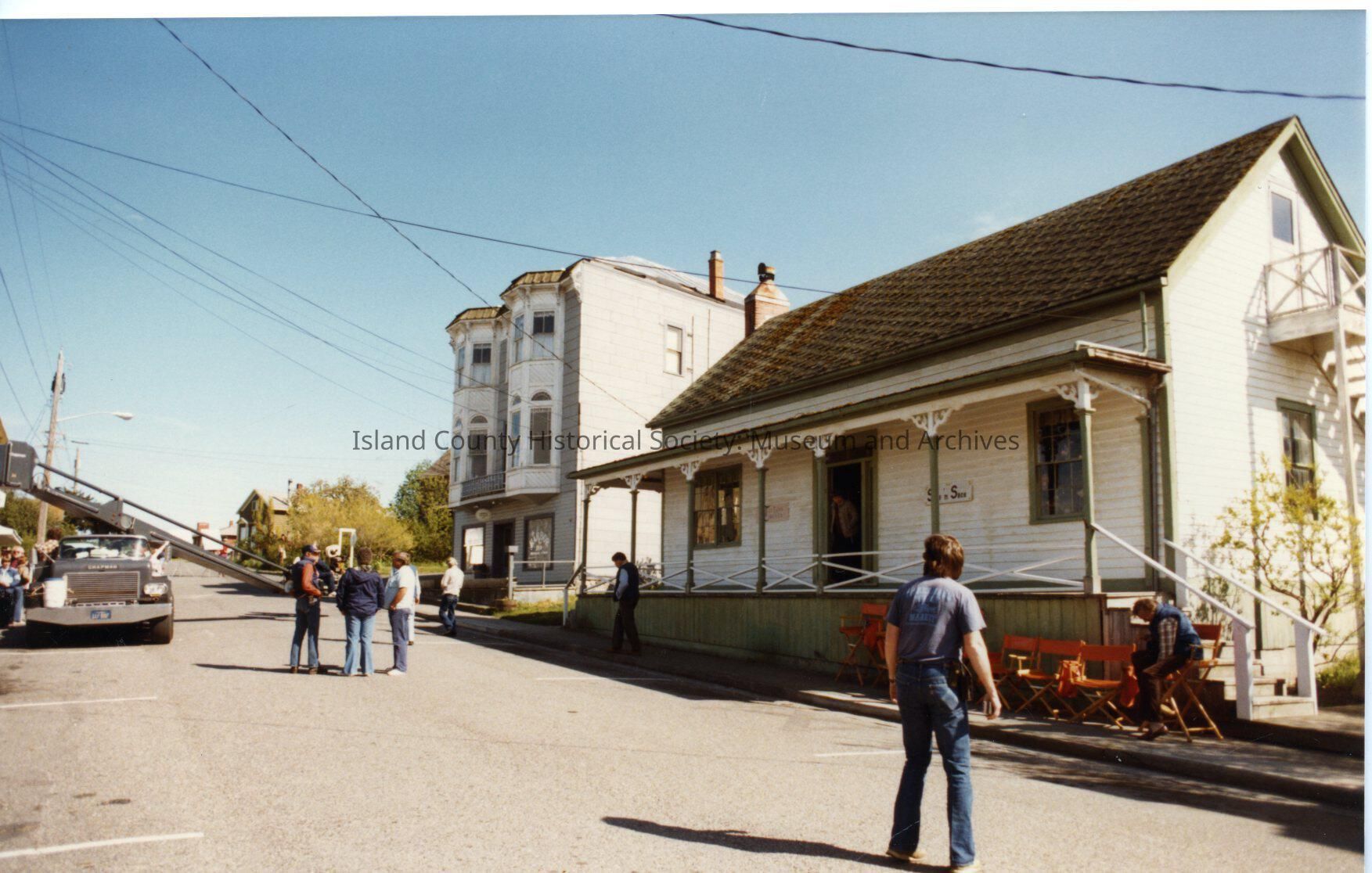 Color photograph of film equipment and crew on Front Street in front of Glenwood Hotel and Robertson House buildings. Filming of Cry for the Stranger in Coupeville, 1982.
