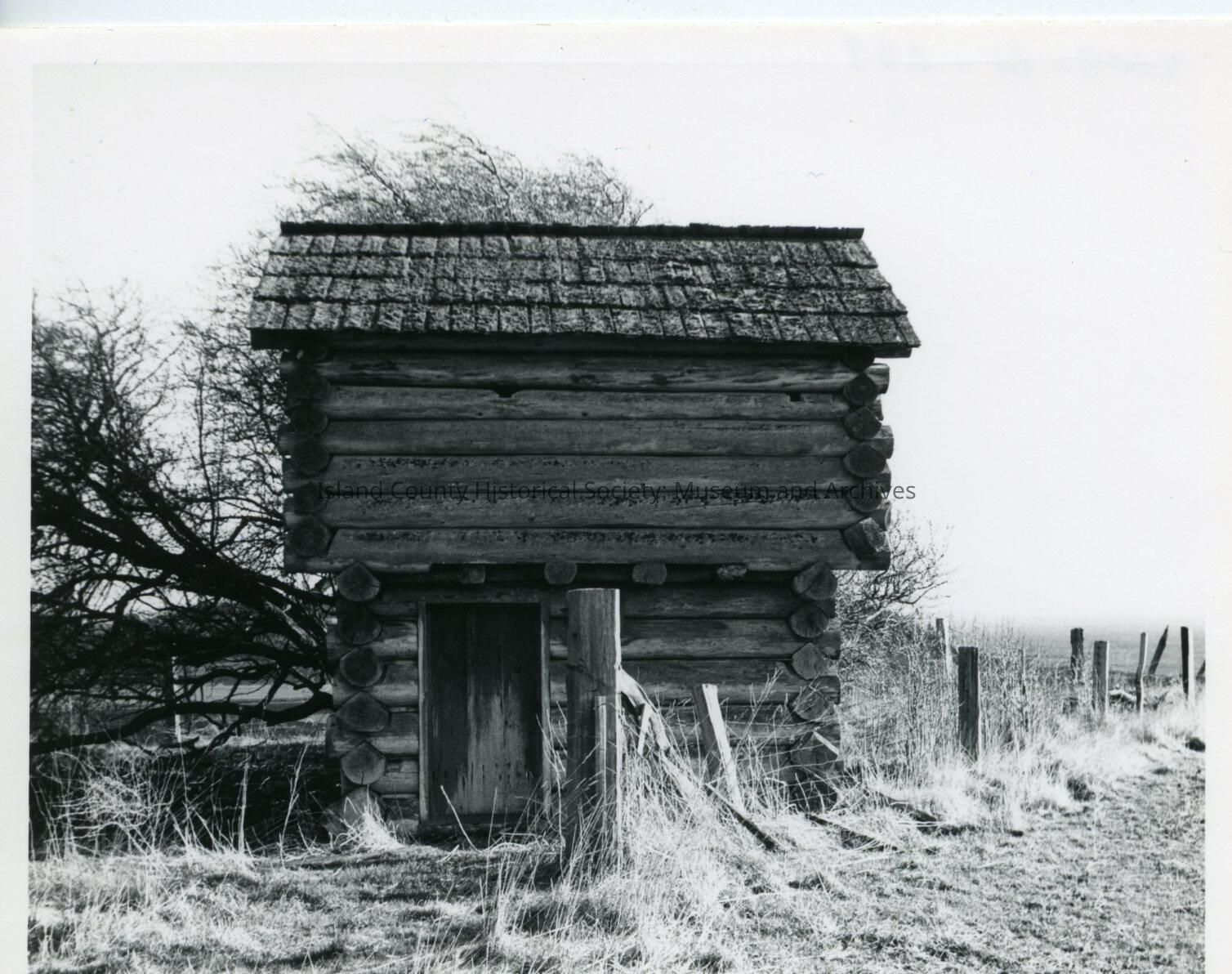 Front of Ebey blockhouse with the door to the left. There are no windows on the front. Poles for a fence run along the blockhouse. On the back: Ebey blockhouse - 55-56. Photo 1971
