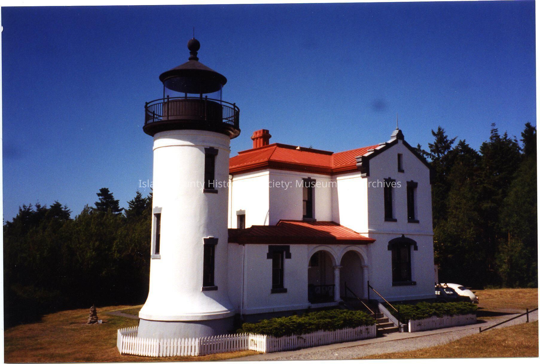 Colored picture of Fort Casey Lighthouse. A classic car is partially visible in the background.