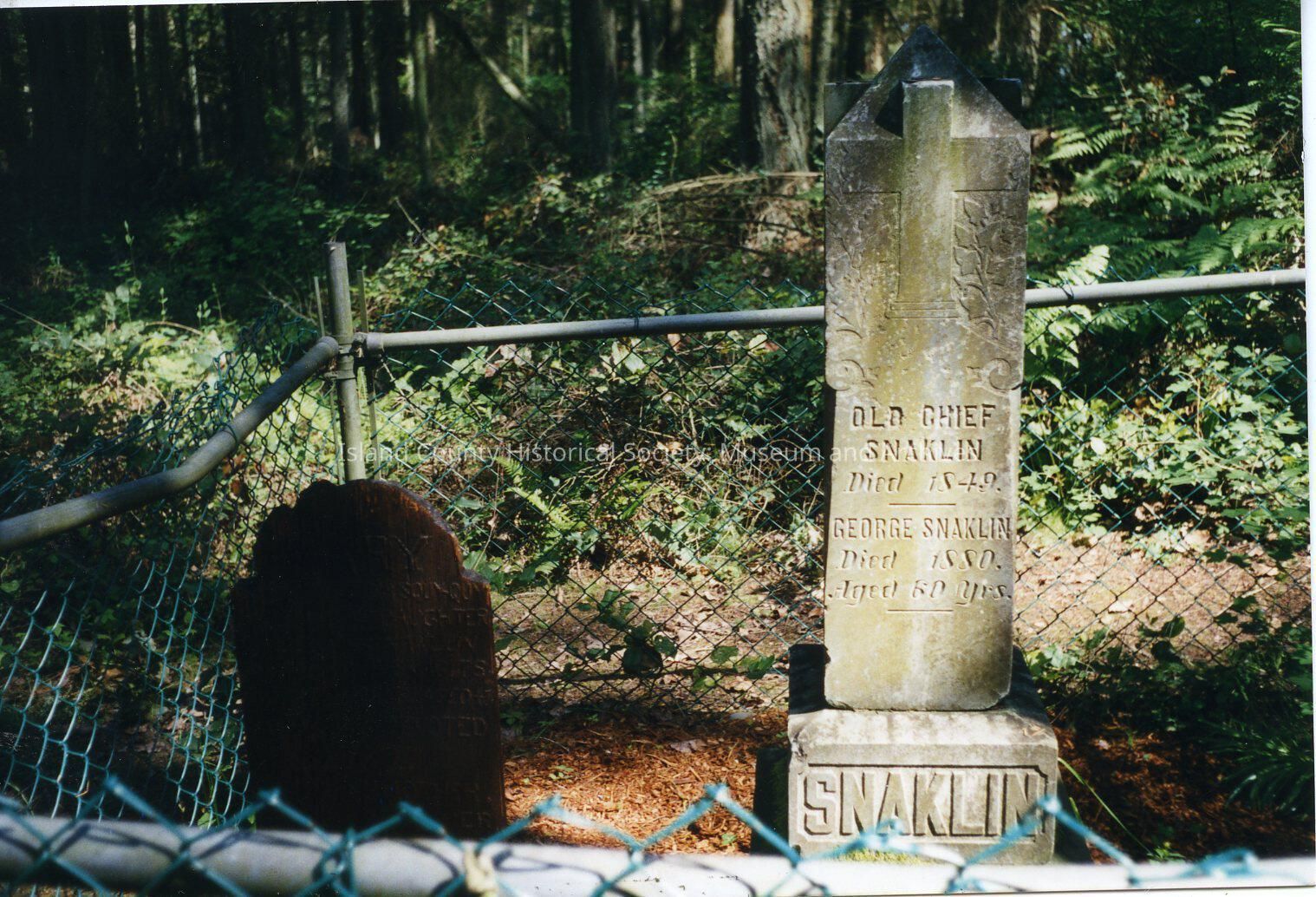 Color photo of Old Chief Snaklin gravestone memorial in Coupeville. In the pictue the tombstone is surrounded by a fence with gray poles and green fencing material. Right next to Old Chief Snaklin's grave is another tombstone but the writing is illegible.