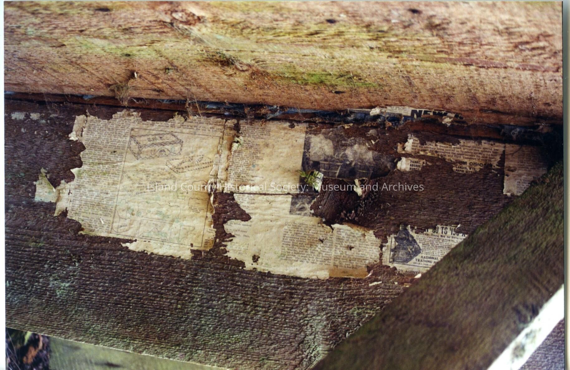 Chinese Tenant Farmer House. Inside view. The image shows several newspaper clippings that have been used to insulate the house. Most of the clippings are damaged and can not be read. In one clipping that is mostly intact there appears to be some sort of box that is on sale.