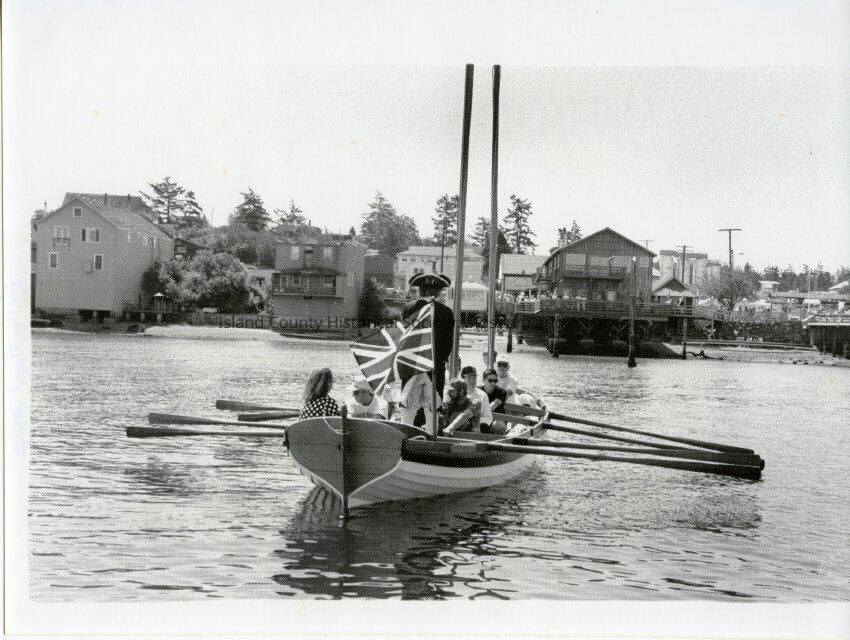 Coupeville Water Festival, 1992. Black and white photo. One of the 8-person row/sail boats is in the water off the wharf. A man in Colonial uniform is standing in the stern holding the tiller. Behind him is the Union Jack/British flag. The boat is facing Front Street and heading in.Collection