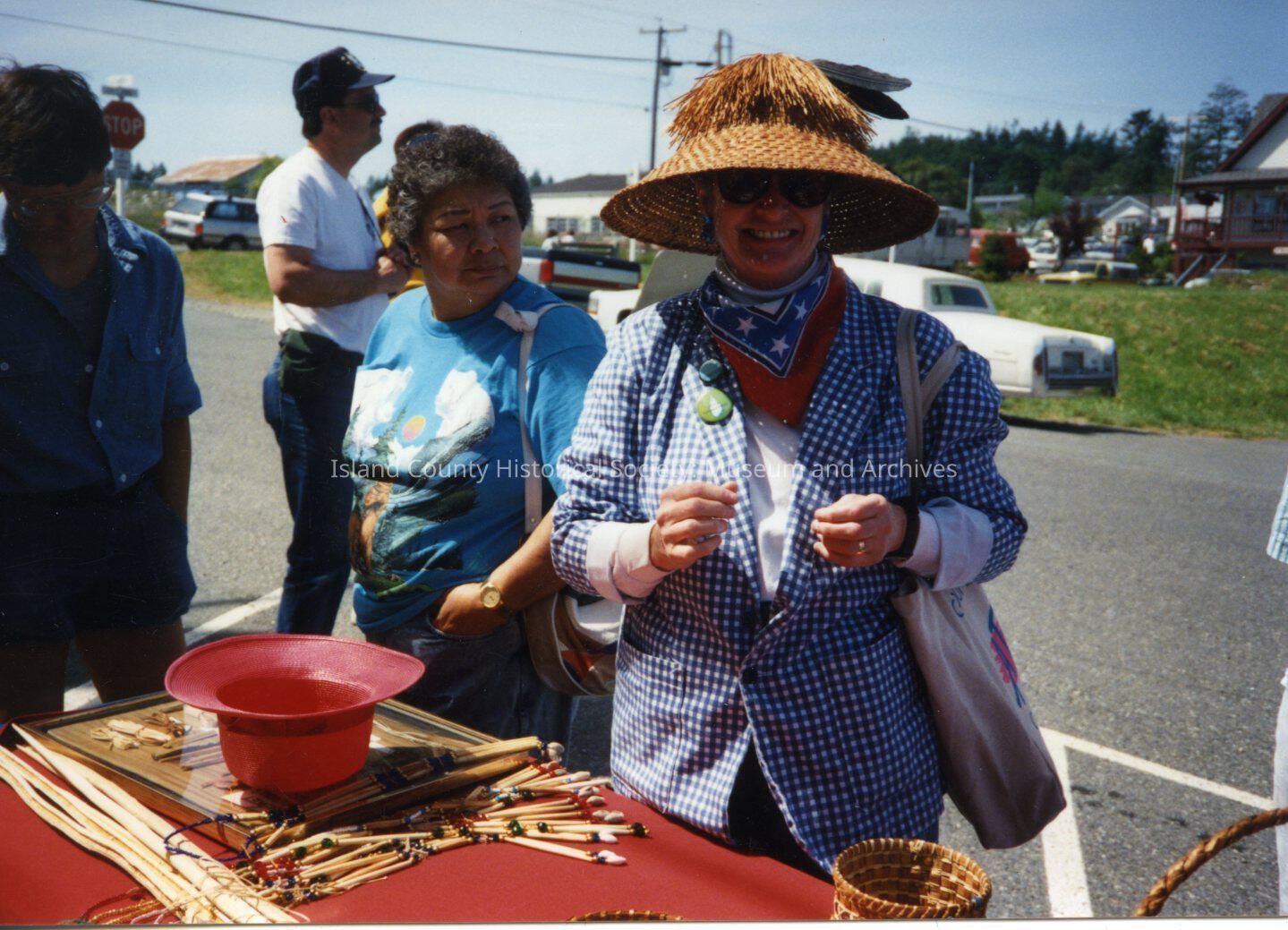 Photo of several people at the Water Festival in Coupeville. Name handwritten on back of photo is Emily Ramsey and '92.
