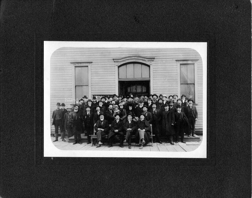 A photo of many men sitting and standing in front of a building. Handwritten on the back is " Dairy Mens Association."
