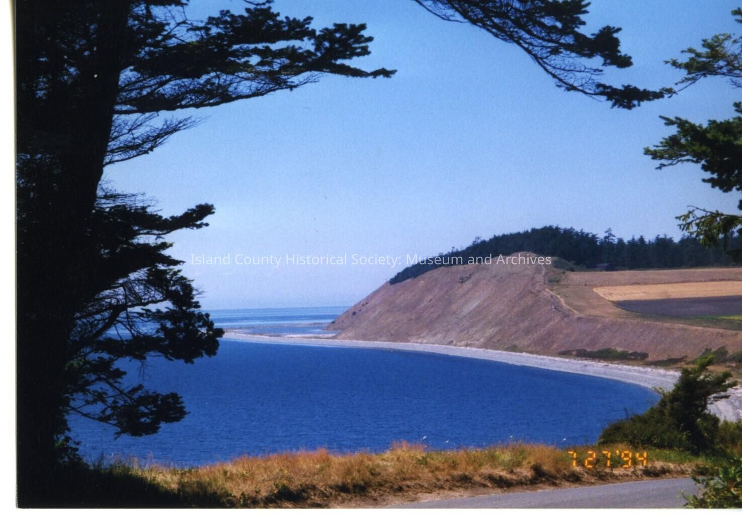 Color photo of Ebey's Landing, showing bluff and harvested crops in the distance right side. Wooded ridegline and beach below. Date stamp on photo is 7.27.94.