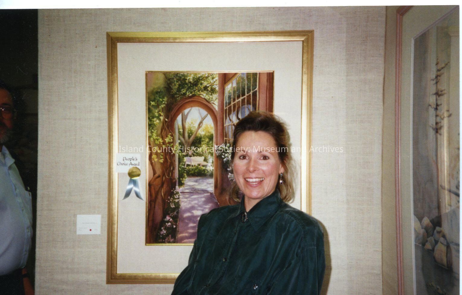 Woman standing by painting at the Coupeville Rec. Hall Arts and Crafts Festival. Handwritten on back Theresa Saia.