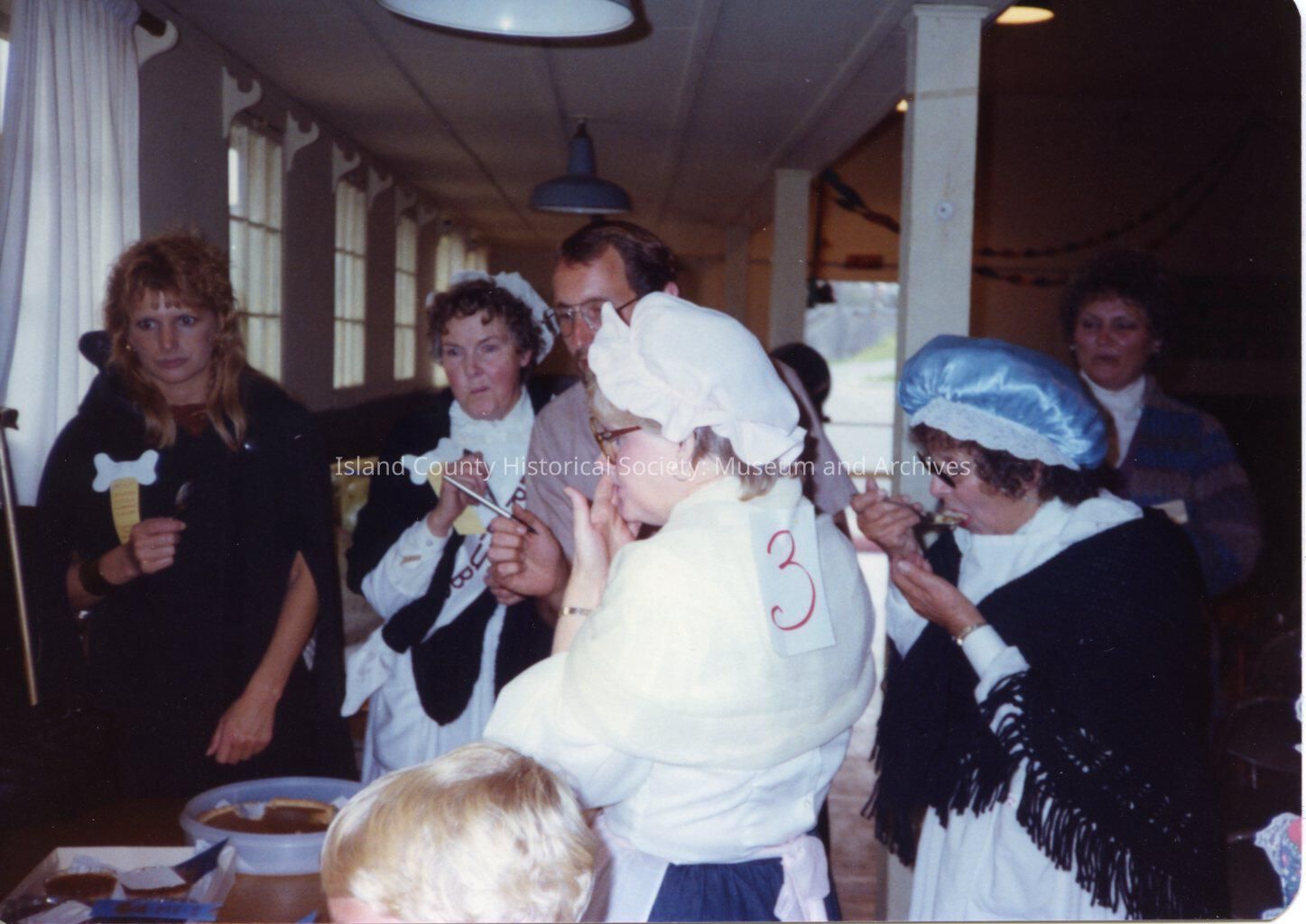 Photo of Coupeville festival. Several women dressed in period dresses with caps. On the back of the photo handwritten Shari,Bethel,Patty, and Carse Frazer.