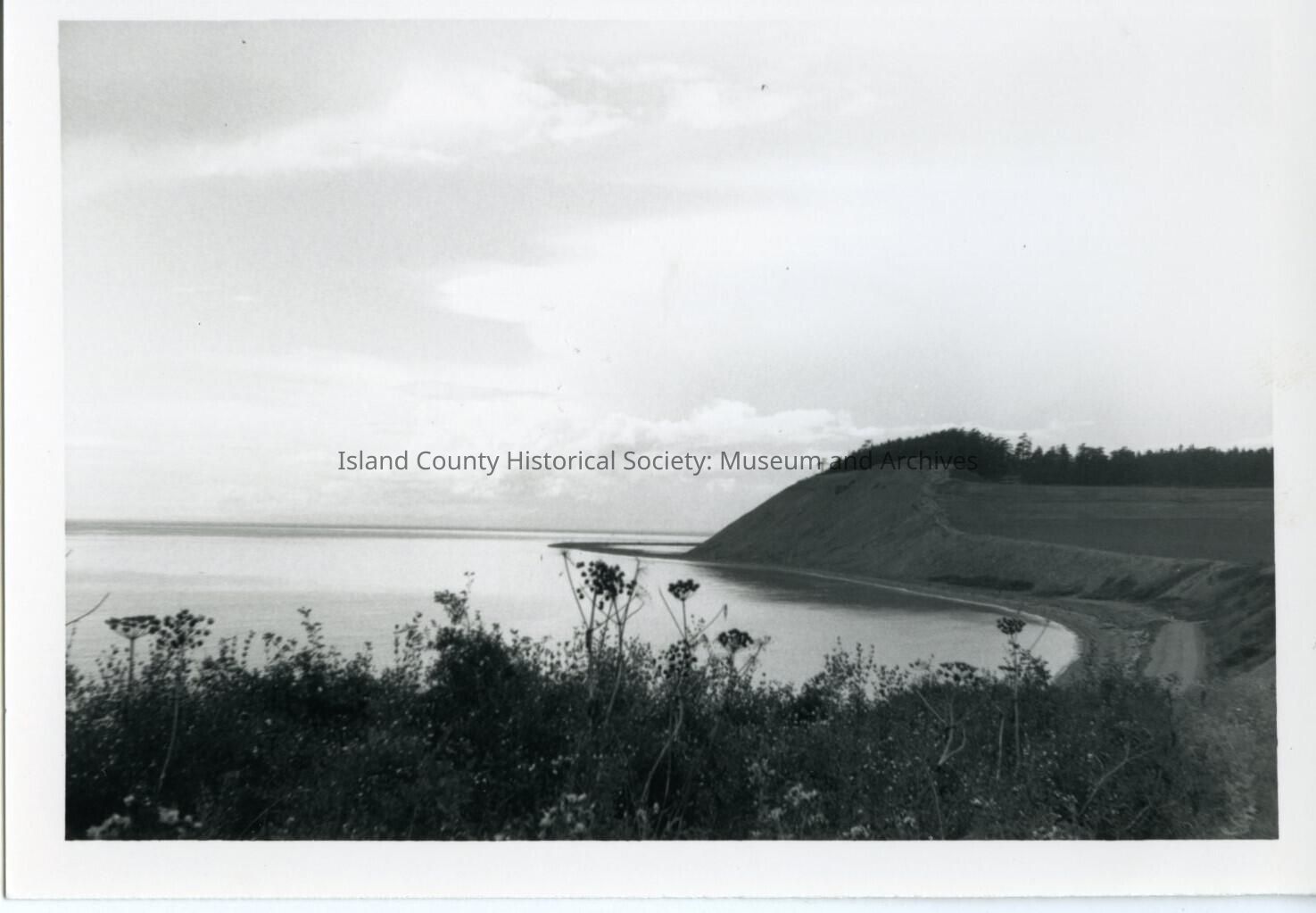 Black and white photo of Ebey's Landing and bluff with wooded ridgeline in the distance. Shows beach at what appears to be low tide. No known date associated with the photo.