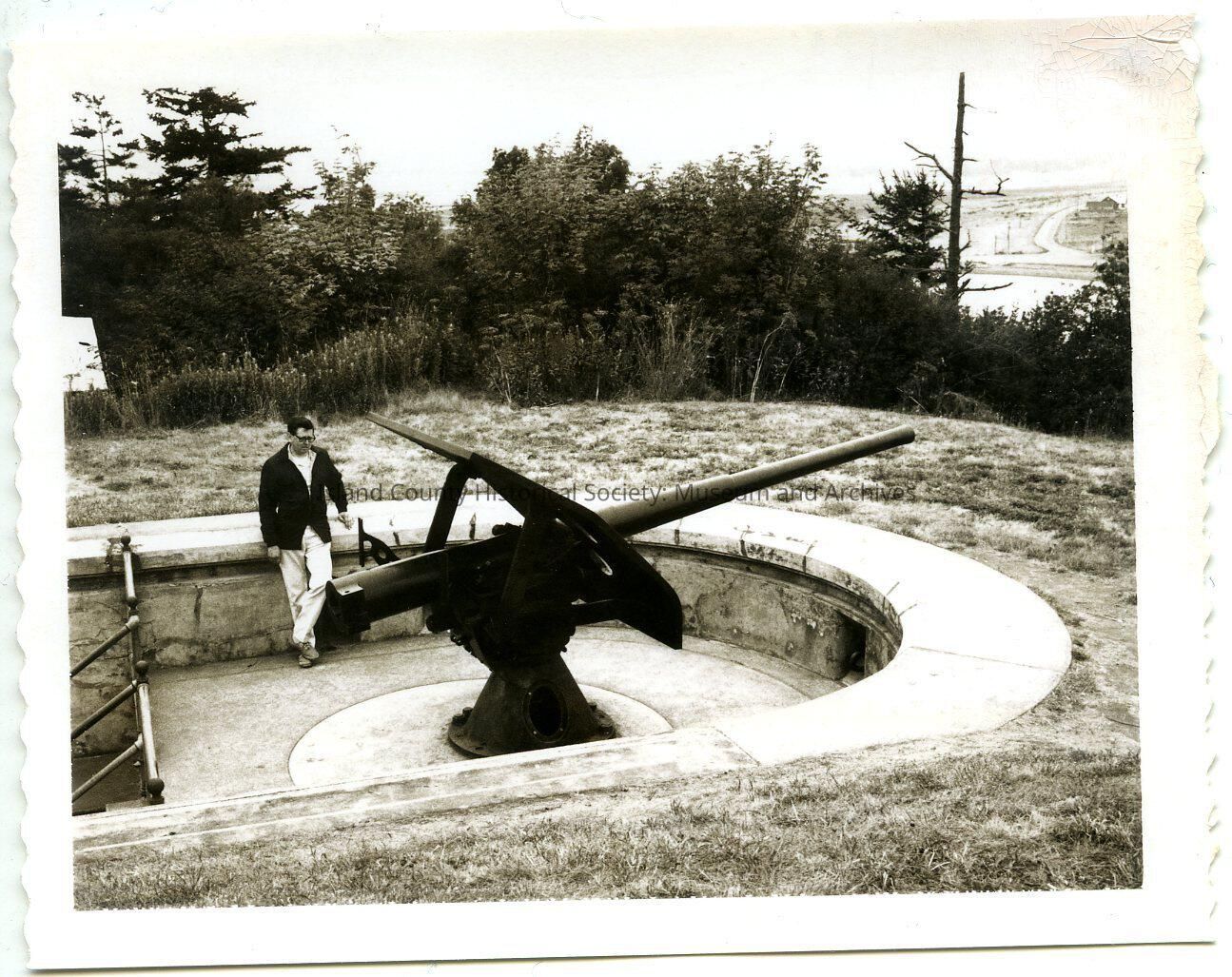 Black and white Polaroid photograph of one of Fort Casey's smaller guns and a gentleman in a black jacket.