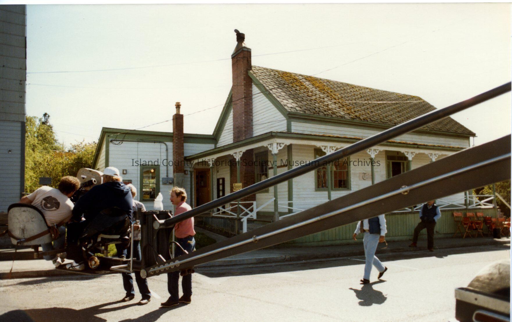 Color photograph of film equipment and crew on Front Street in front of Robertson House building. Filming of Cry for the Stranger in Coupeville, 1982.
