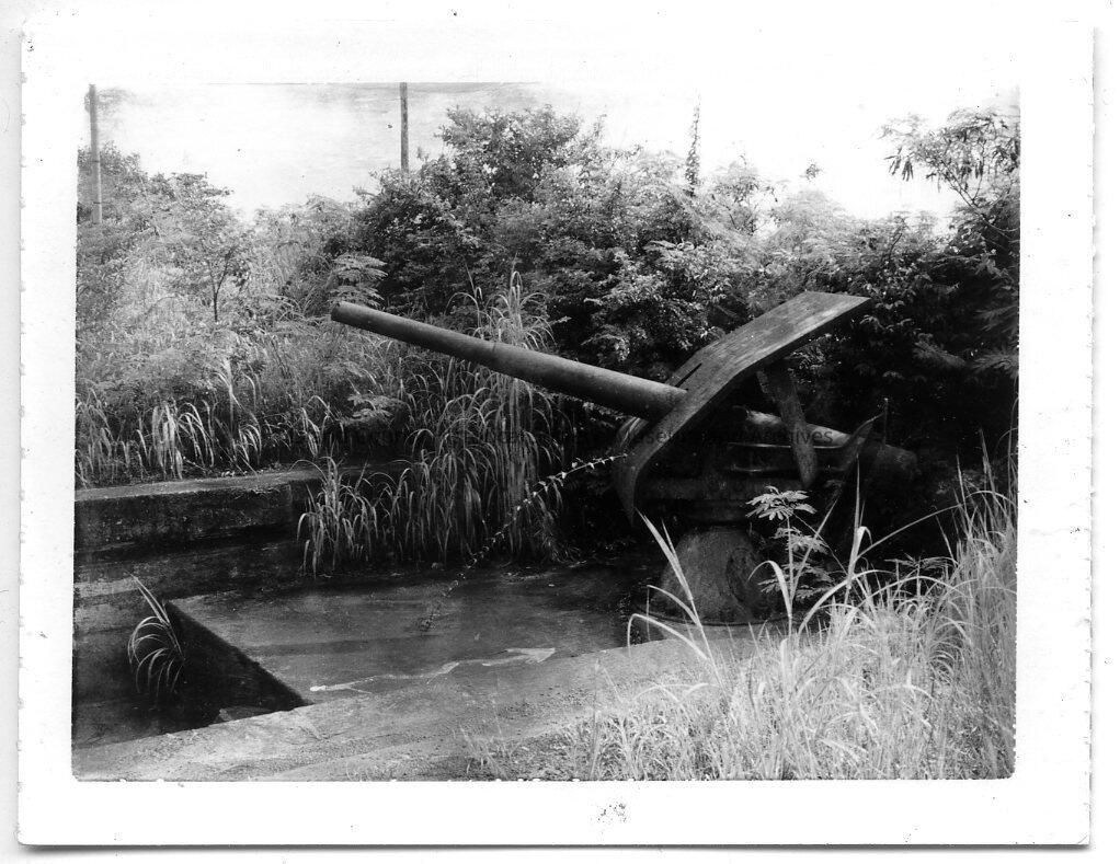 Black and white Polaroid photograph of a gun and trees. Written on the back: 4" cannon in secondary battery #1 Grande Island P.I. 3 oct. 1961