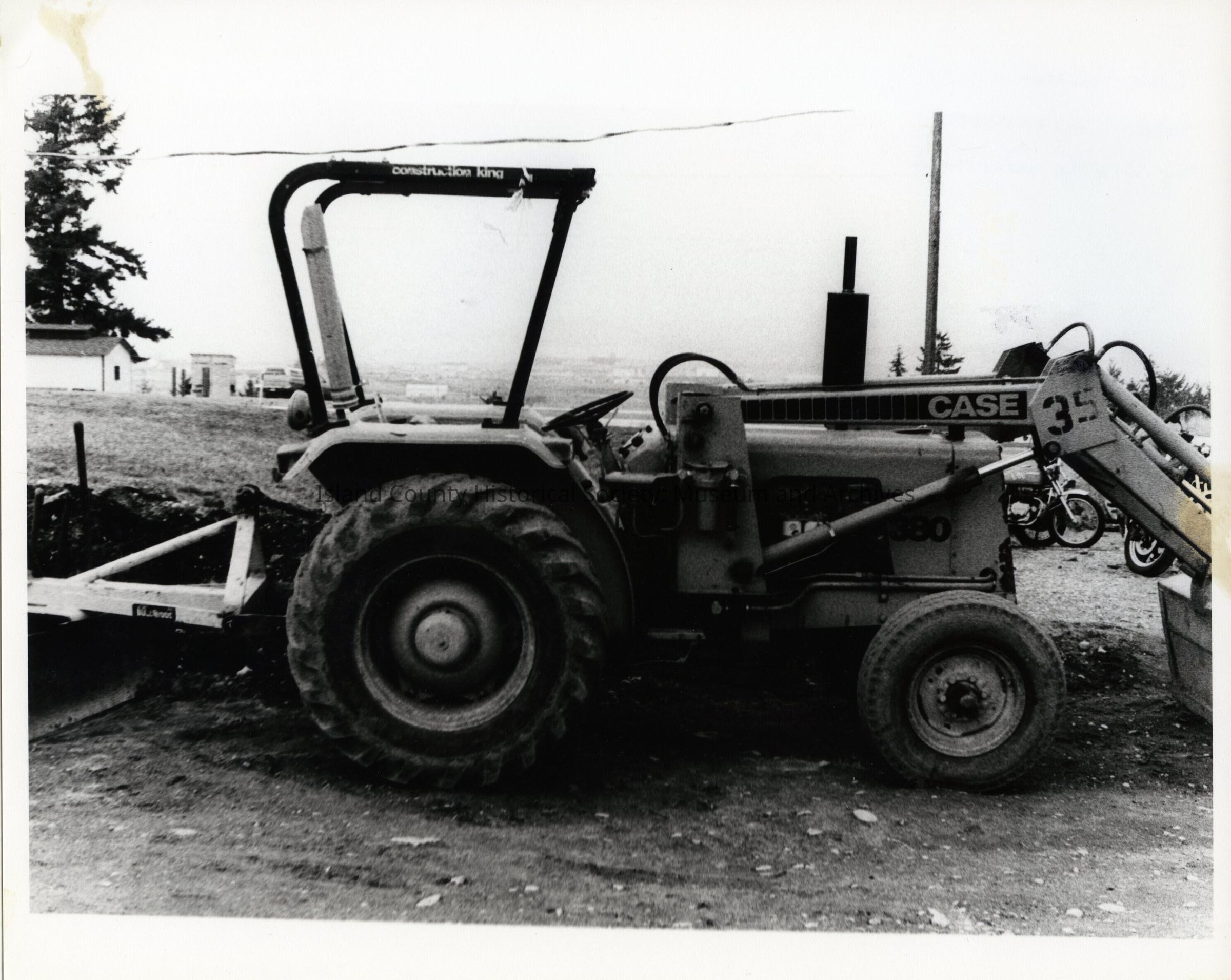 A Case tractor takes up the whole image. A few out buildings and trucks and motorcylces can be seen in the background. The back of the image reads, "Oak Harbor taken mid-1980's by Orville Westlund."