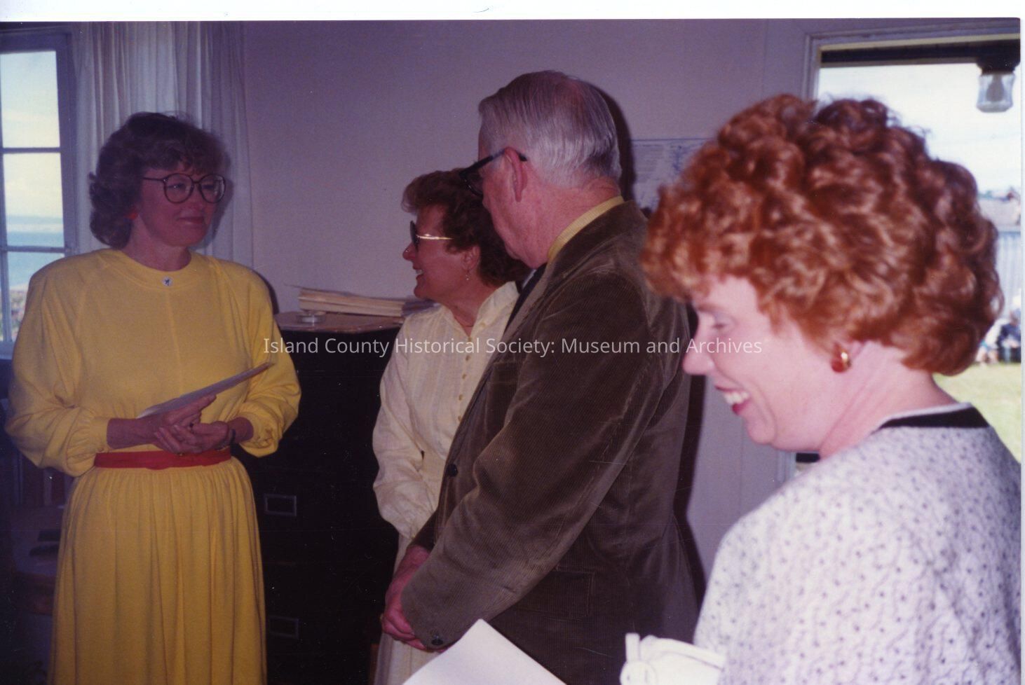 Four people inside building. Handwritten on back "Jean Gardner, Betty Coyne, John Coyne? 7/88.