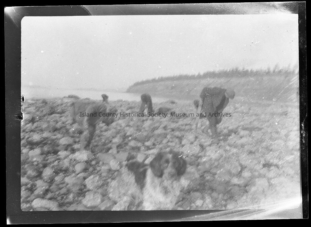 Black and white. Rocky beach. Dog in foreground. Men searching - they are ben over looking at the ground. Bluff in the background. Trees. Ebey's Landing.