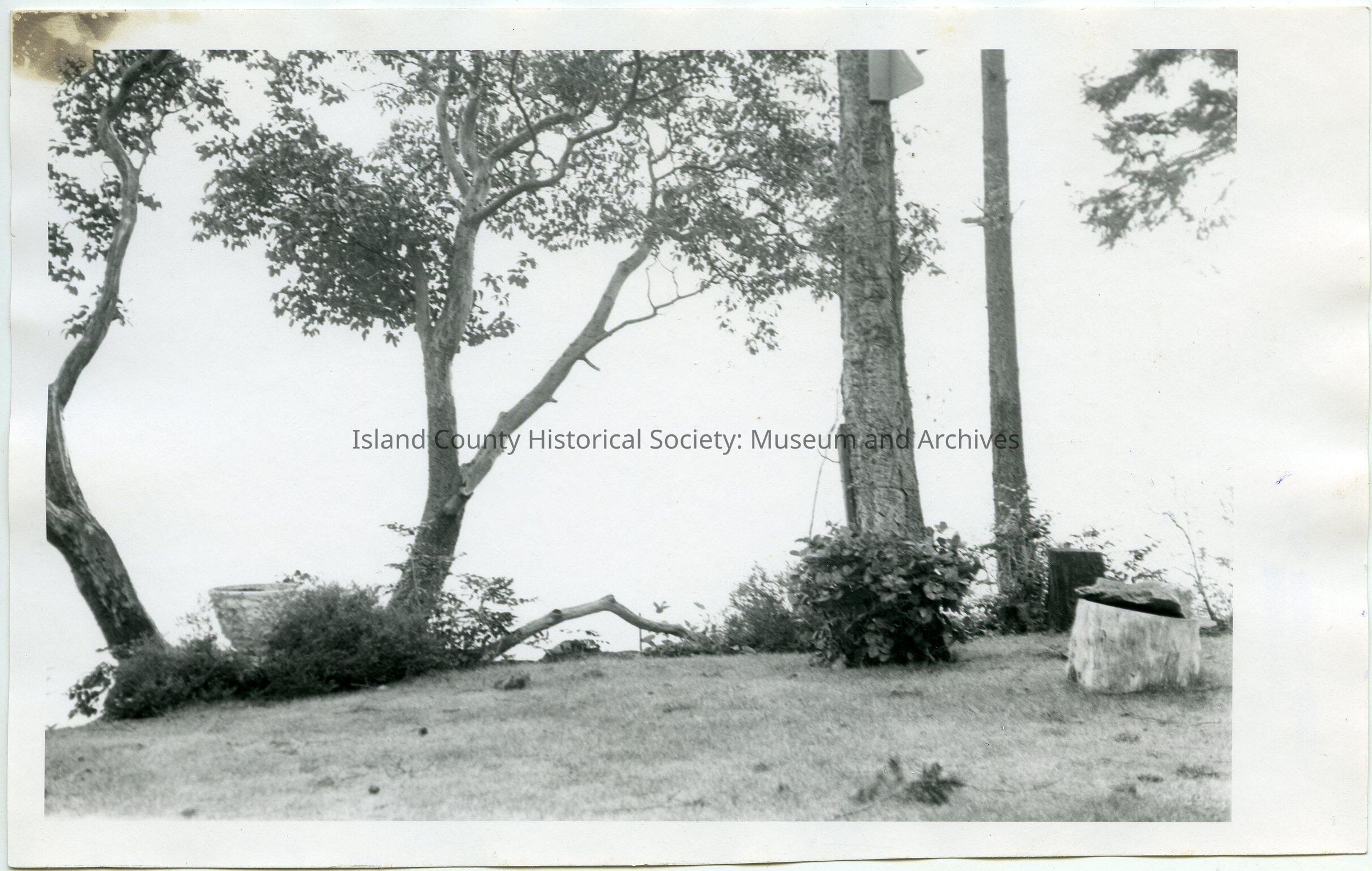 Photo of Penn Cove (not really visible) looking from Madronna Way north. Trees, one has a sign at the top of the photo, and stumps. Large planter on the bluff. Same image as 2019.034.127. From the folder: Madronna Way