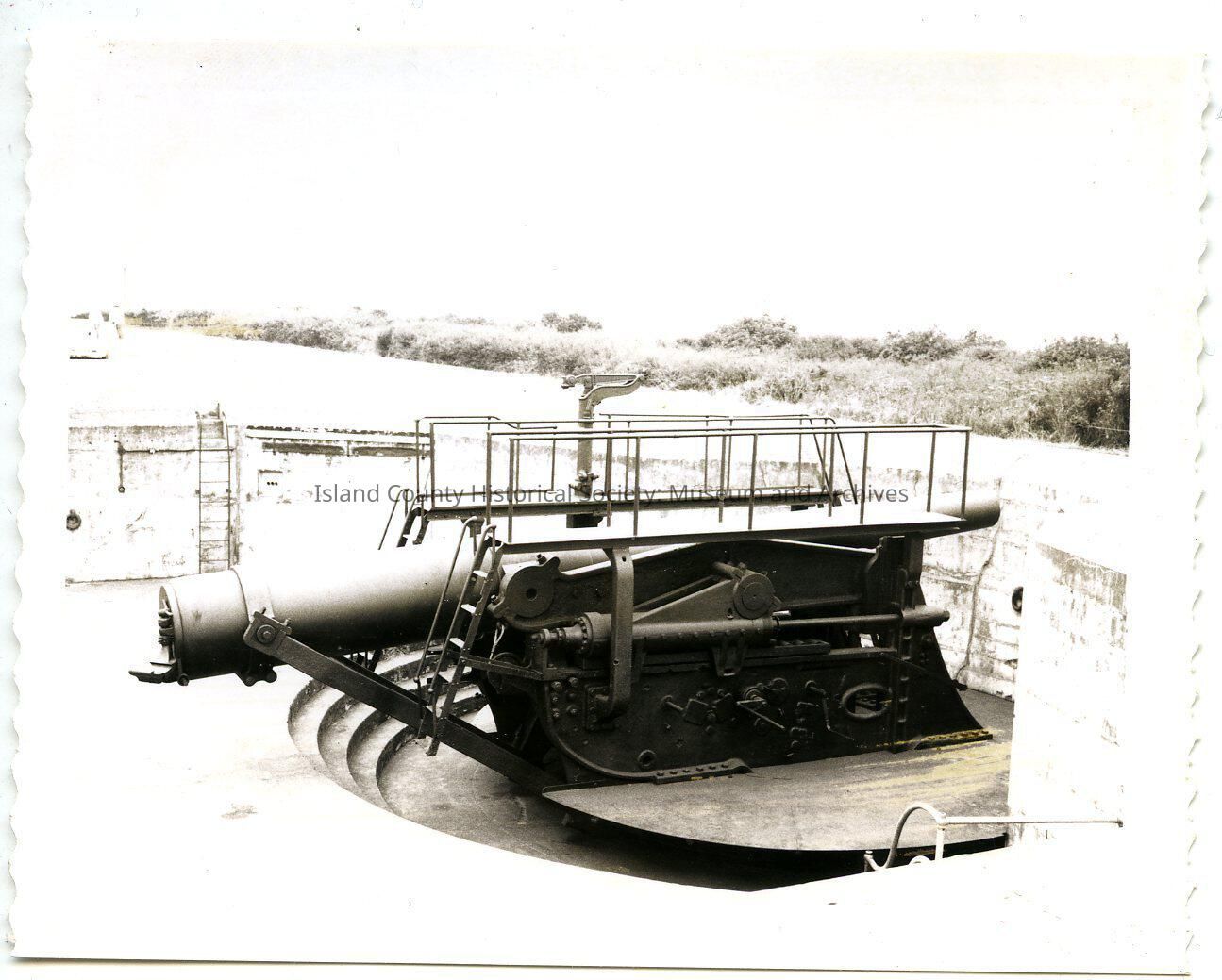 Black and white Polaroid photograph of one of Fort Casey's dissapearing guns.