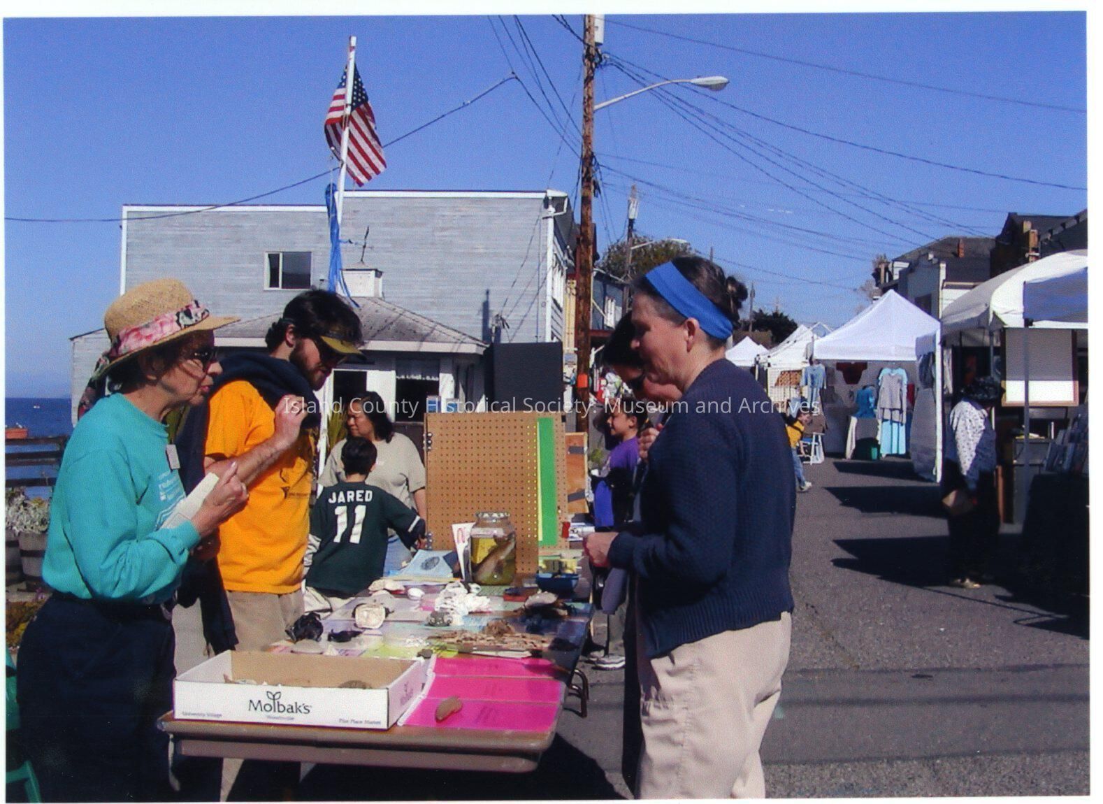 Coupeville Water Festival, 2002. Men and women on Front Street at a vending table. Other vending tables and marquees along Front Street.
