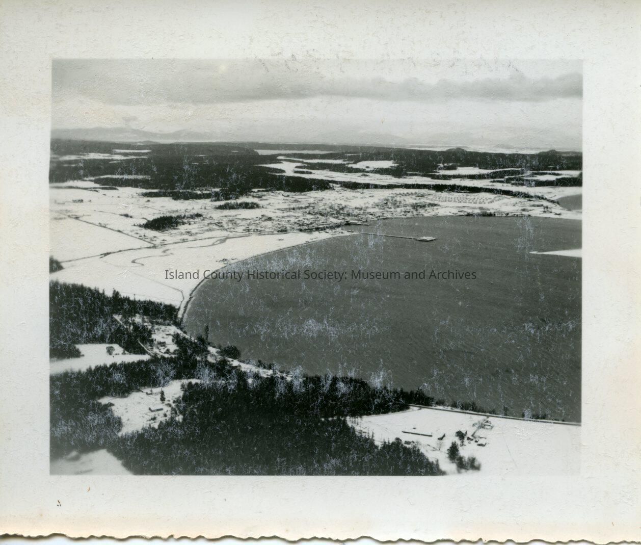 An aerial view of Oak Harbor covered with snow. The back reads: "O.H. March 1951." The harbor is on the right of the picture with farm land and the town seen in the distance. The Maylors dock can be seen stretching out into the water.