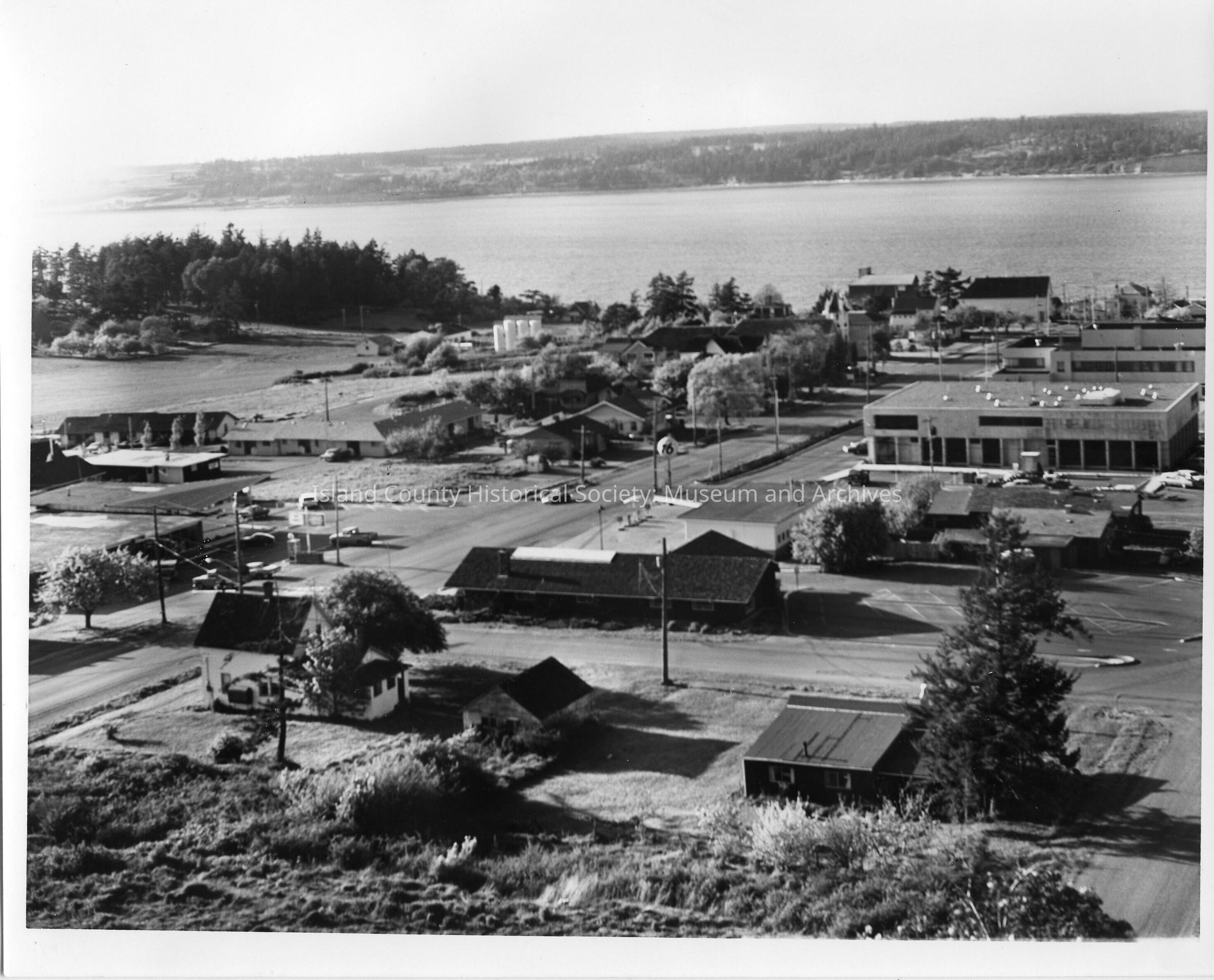 Black and white picture of Coupeville looking northwest towards Penn Cove. Towards the top left is Kreuger Farm, the old 76 station and city municipal buildings.