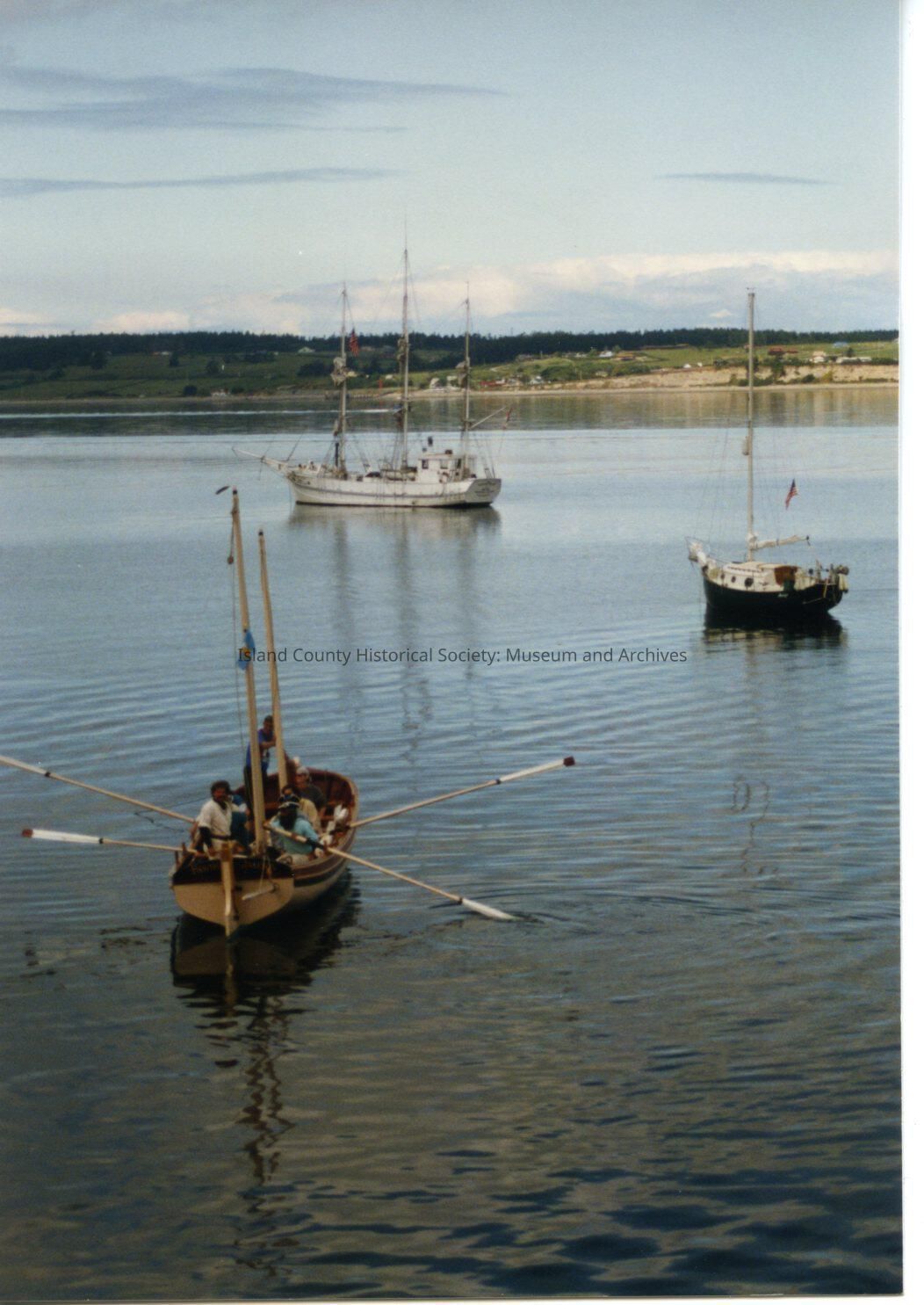 Coupeville Water Festival, 1993. One of the 8-person row/sail boats is in the water off the wharf. A blue-hulled sailboat is at anchor. A three-masted schooner is in the background.