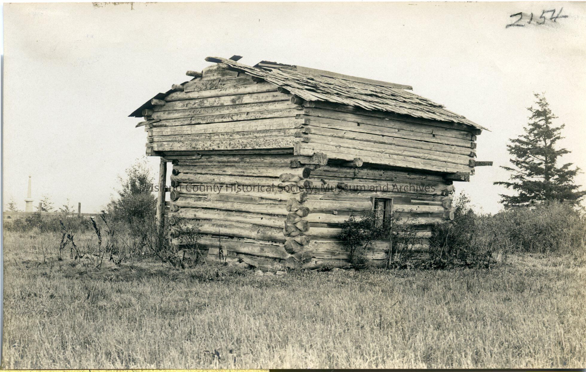 Rear and side of Davis blockhouse. In Sunnyside Cemetery. Tree and headstone in background. On back: Davis Blockhouse by cemetery. Sept. 1907. Photo by W. H. Wilcox.
