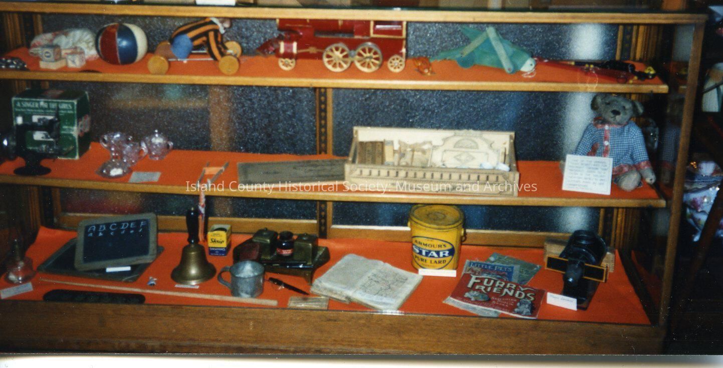 A color photo of wooden shelfs with red covering. There are toys, books, a bell, a ball and what looks like a train or truck on the top shelf. Handwritten on the back is "Child's Toys & Scool Things ICHS Mus. Apr. 1990."