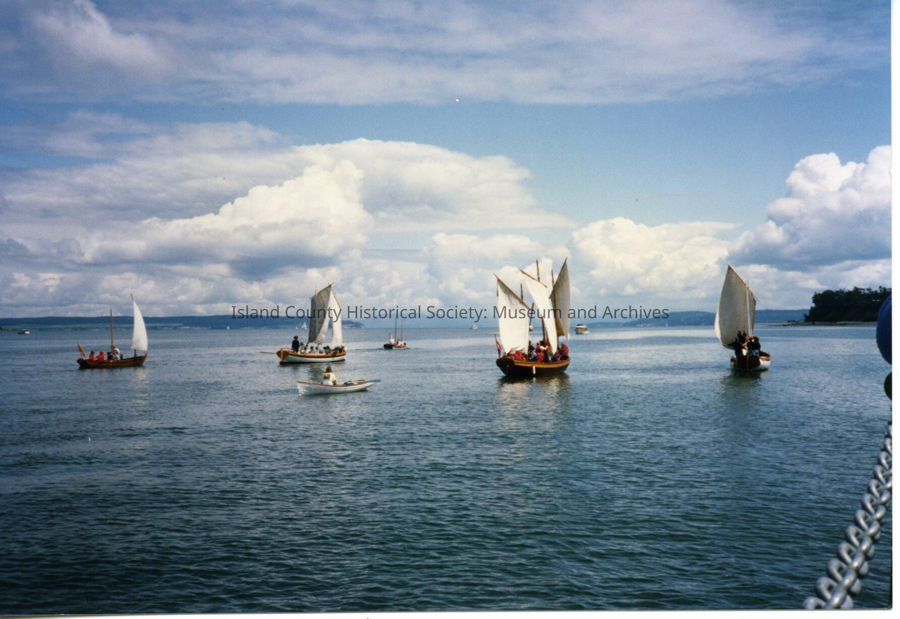 Coupeville Water Festival, 1993. Eight-person row/sail boats sailing in the Cove. A small row boat and motor boat are also present.