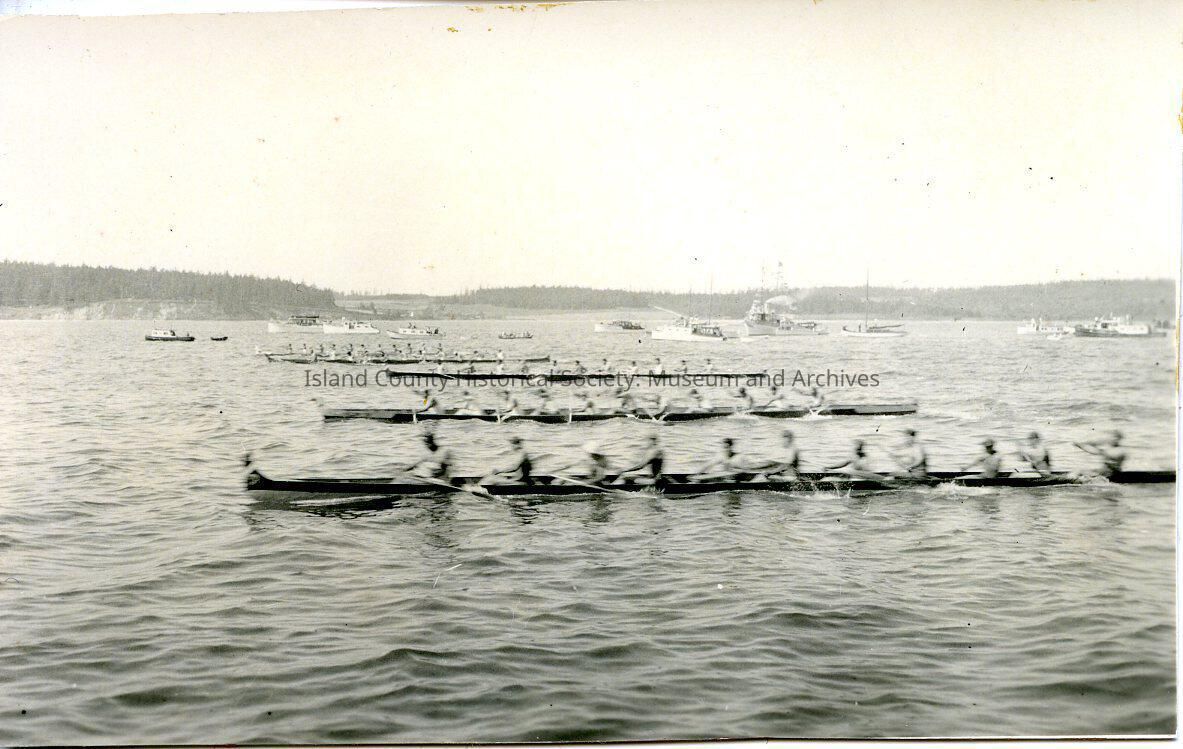 Native American Coupeville Water Festival. At least 5 canoes with 11 men paddling past the photographer. The men in the canoe closest to the photographer are blurred. There are other boats, one probably a small steamship, beyond the racing canoes.Collection