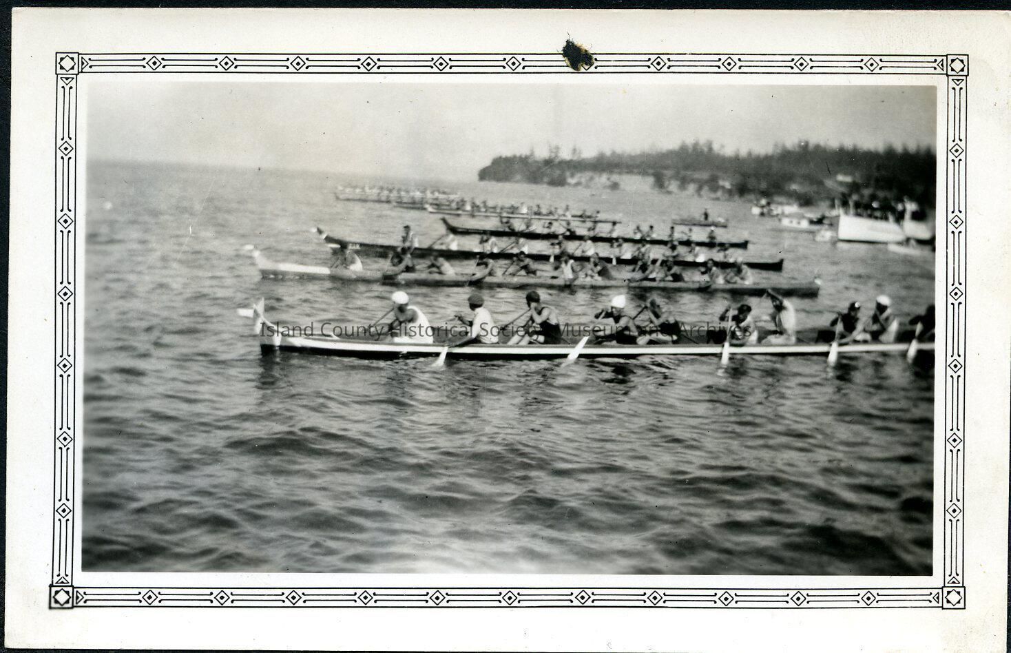 Native American Coupeville Water Festival. At least 8 racing canoes with 11 men each. Spectator boats are to their right (aft of the canoes) along the shore.