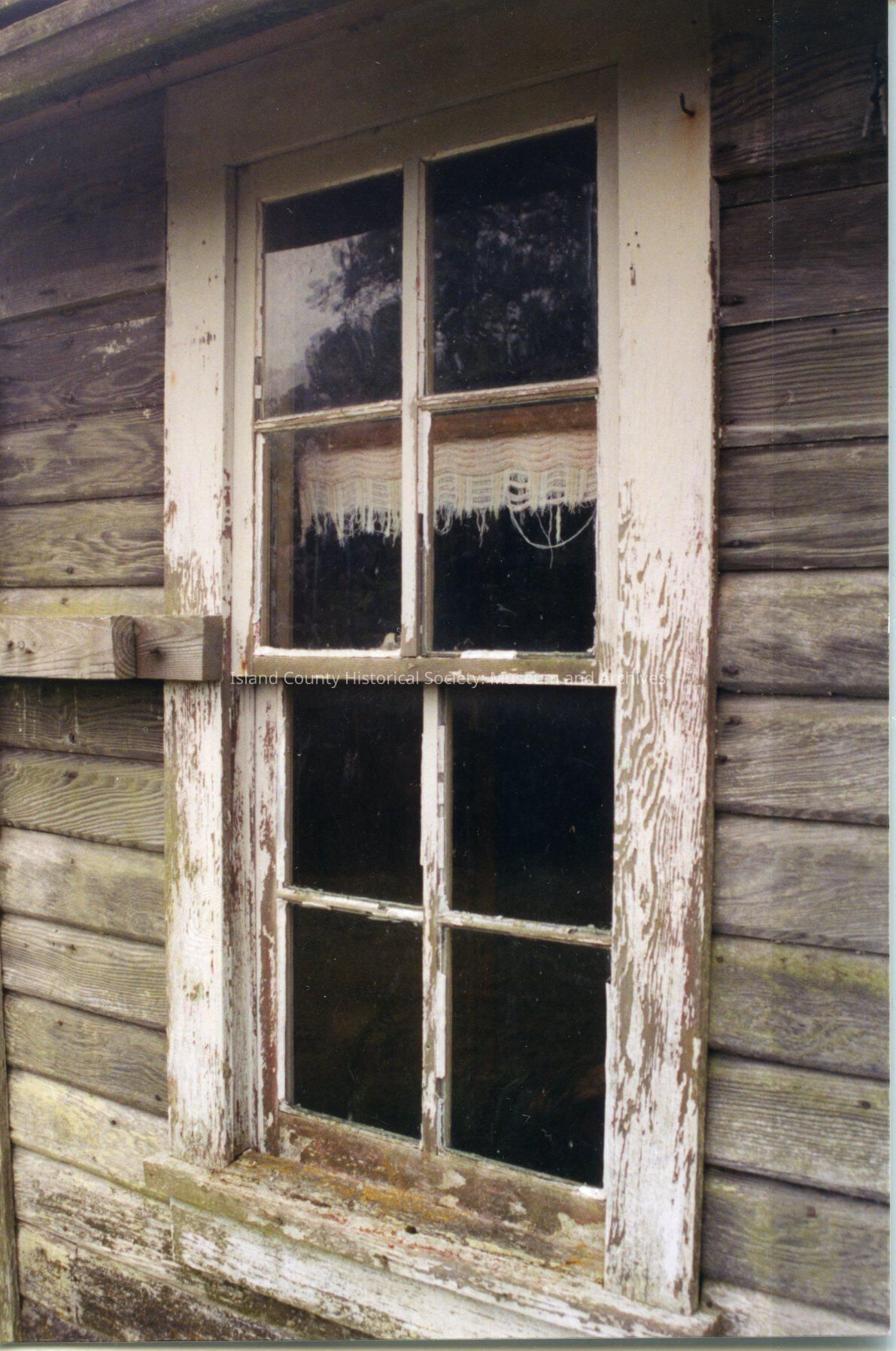Outside view of Jacob Ebey House. Saltbox Residence. Wood frame set on wood post/concrete block foundation: rectangle (20'x32'). Image shows one of the windows that is located at the entrance. In the window one can see the remains of a white curtain on the upper part of the window. The trim covers all four parts of the window.