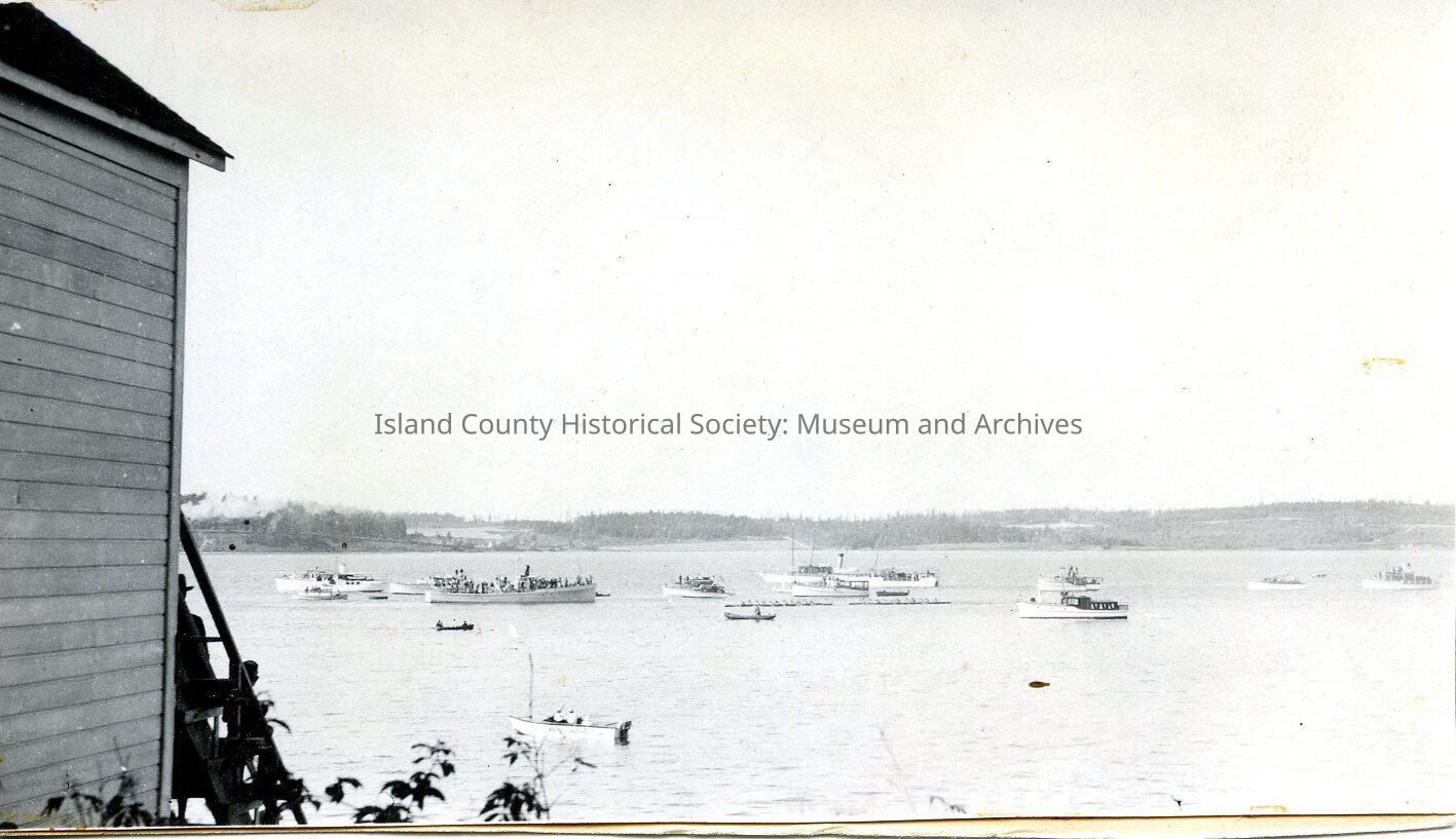 Native American Coupeville Water Festival. View from the wharf. At least two 11-man racing canoes surrounded by a group of motor boats and rowboats with spectators.